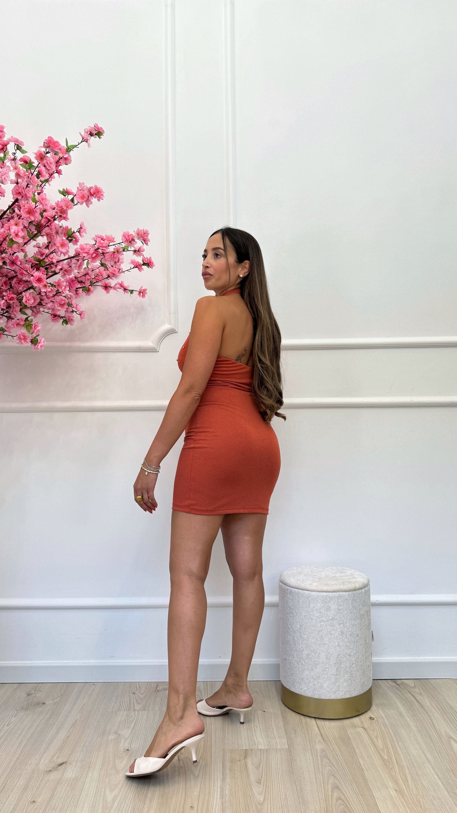 Abito corto halter in misto viscosa con strass.