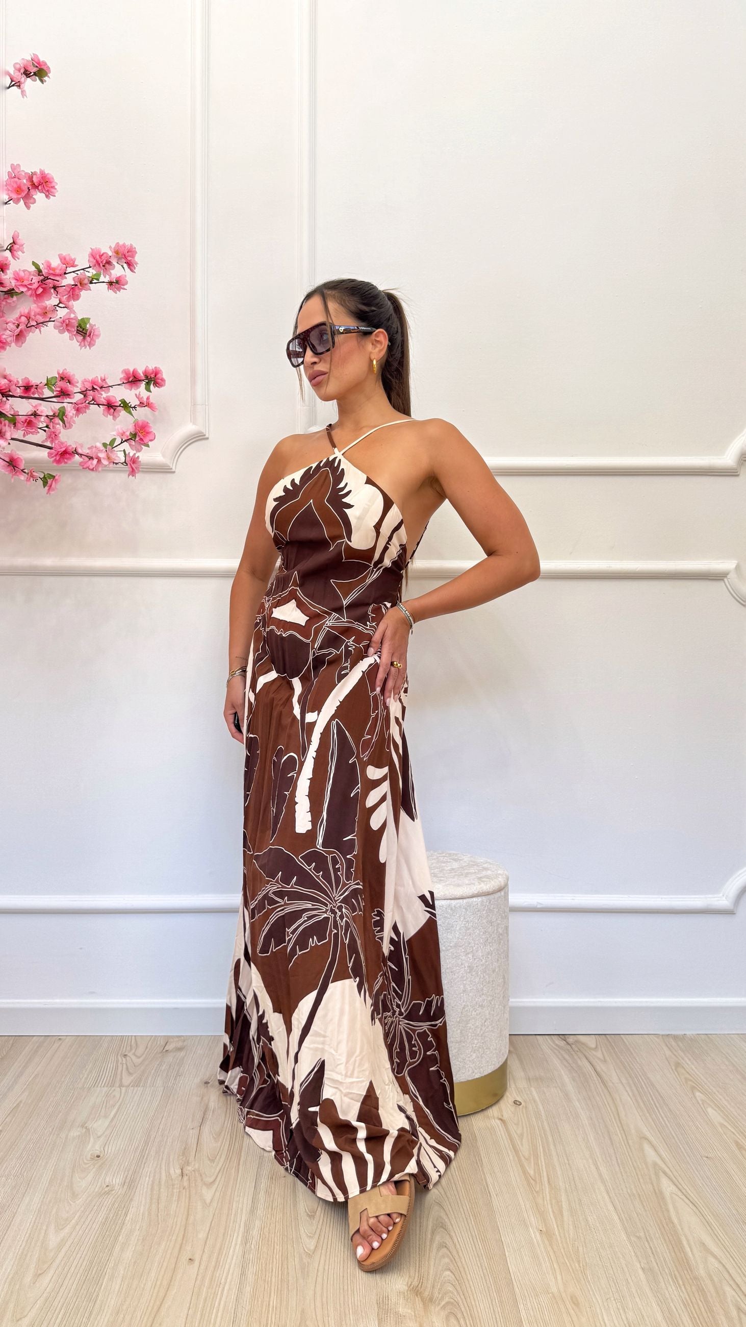 Abito in cotone fantasia lungo, scollo all'americana, bretelle regolabili, schiena scoperta con elastico sul dietro, spacco laterale, vestibilità regolare.