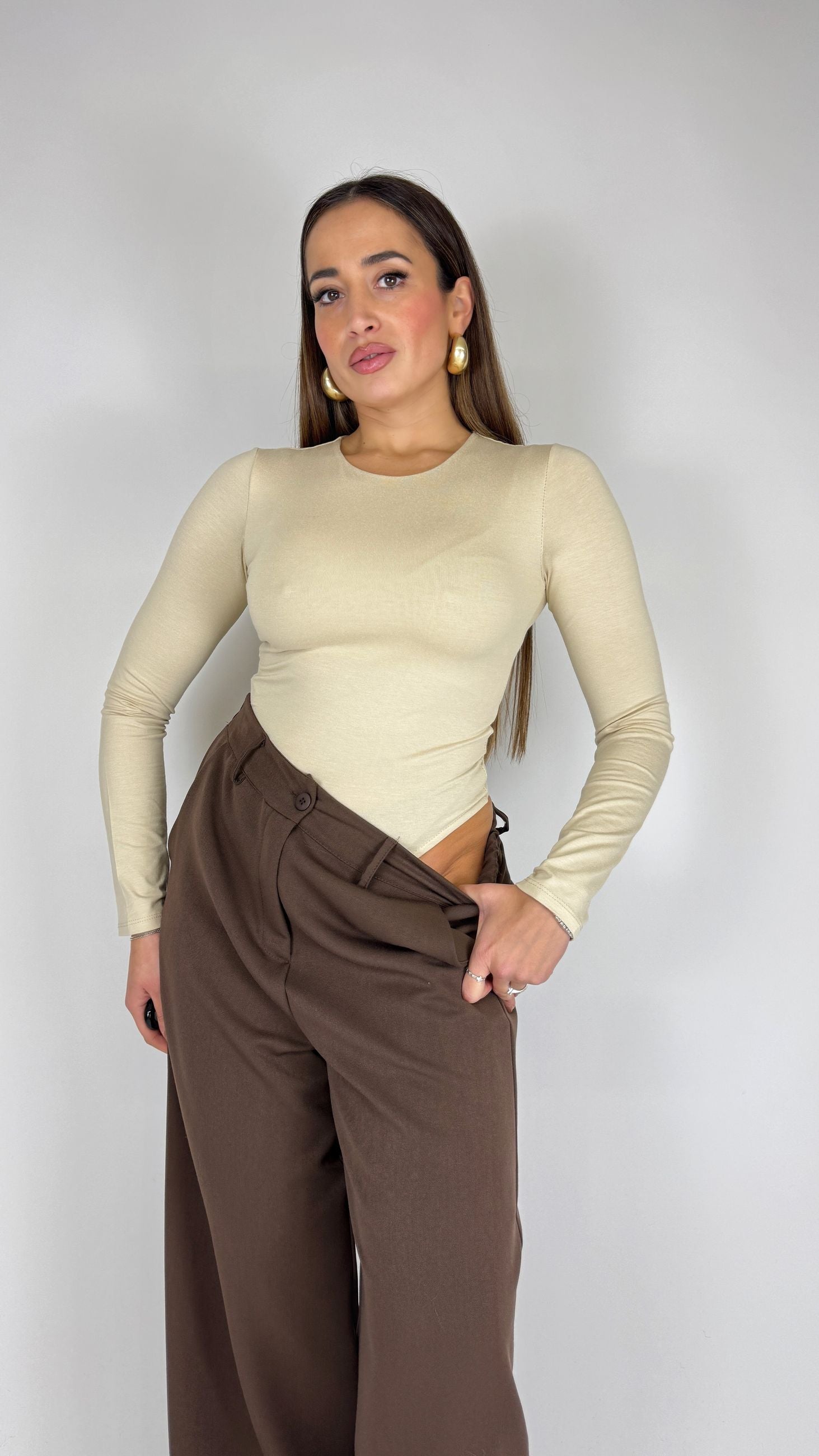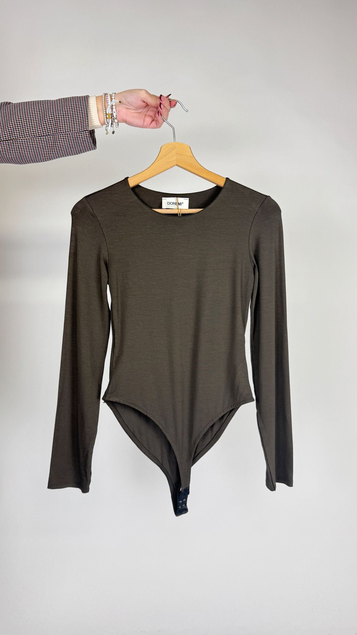 Body aderenti in cotone girocollo, chiusura con gancetti.