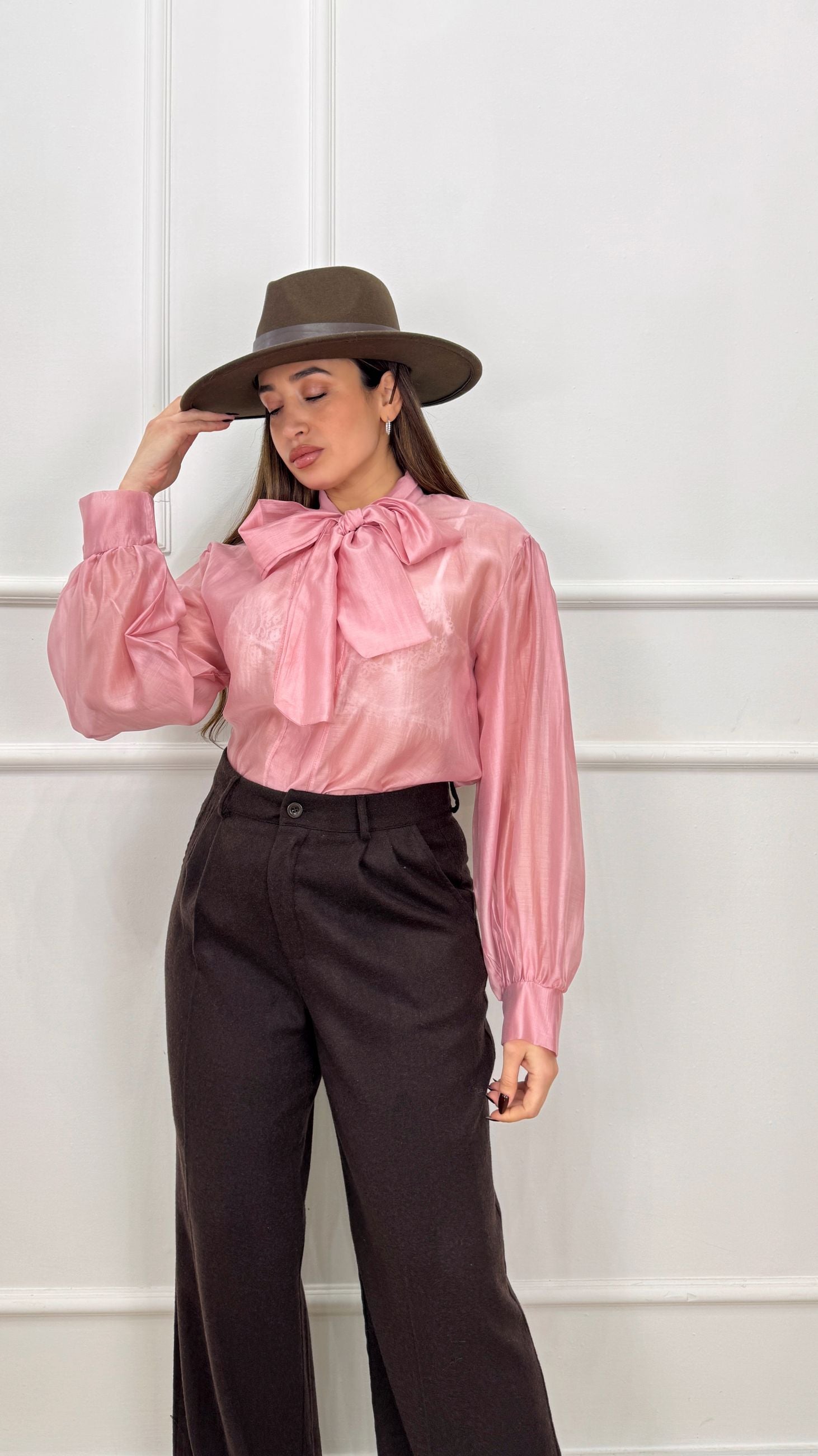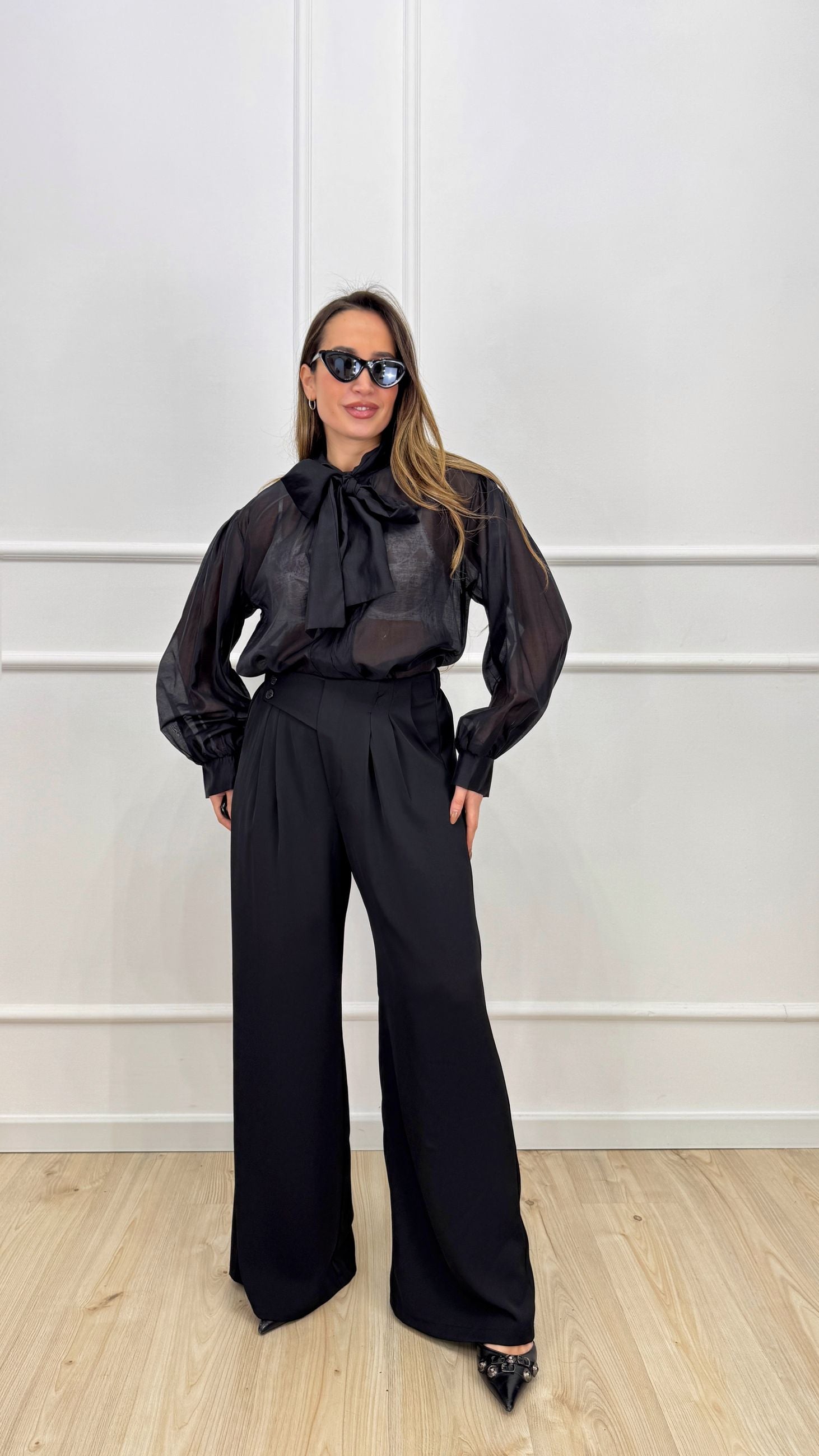 Camicia in tencel trasparente, con fiocco regolabile al collo, manica e vestibilità ampia.