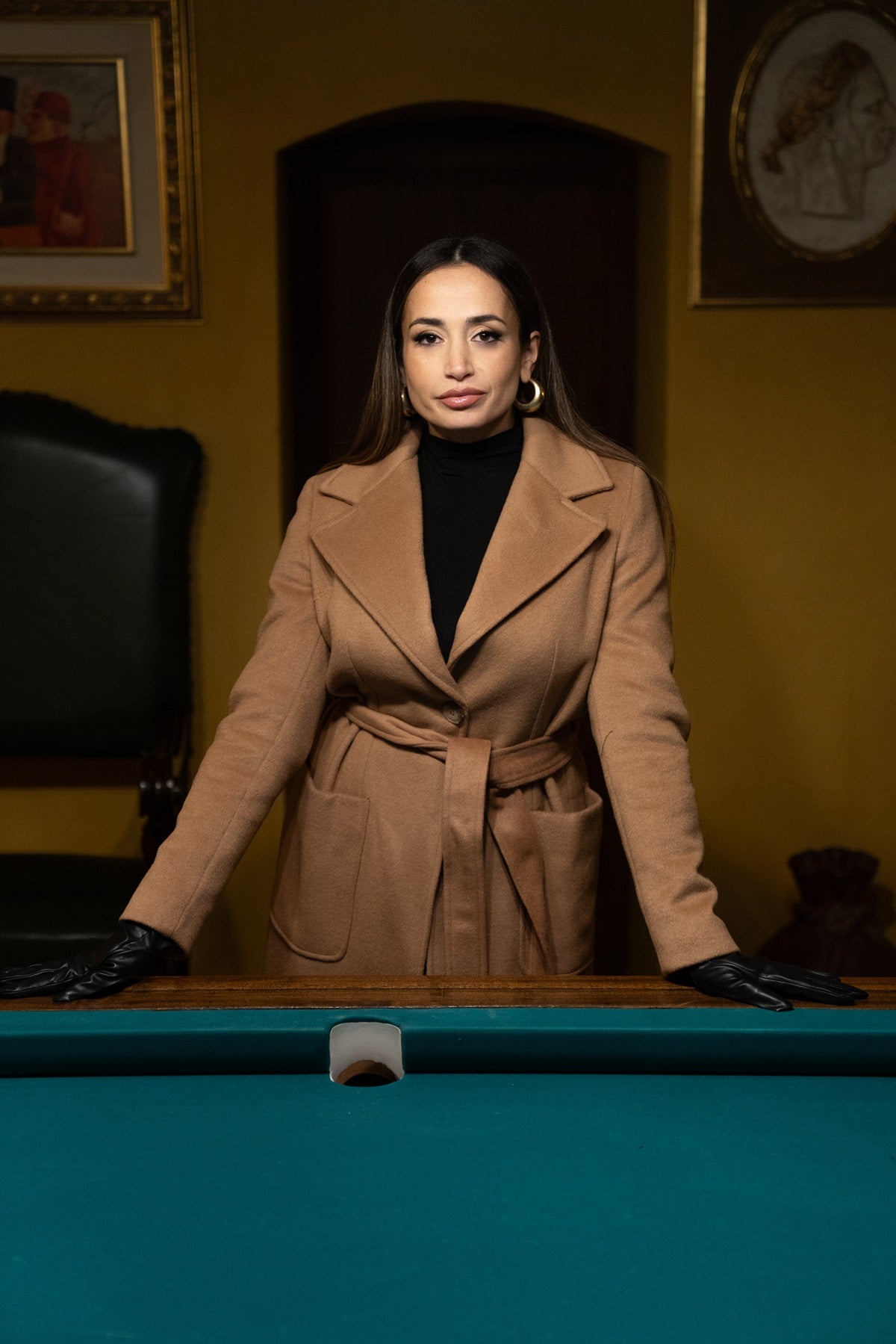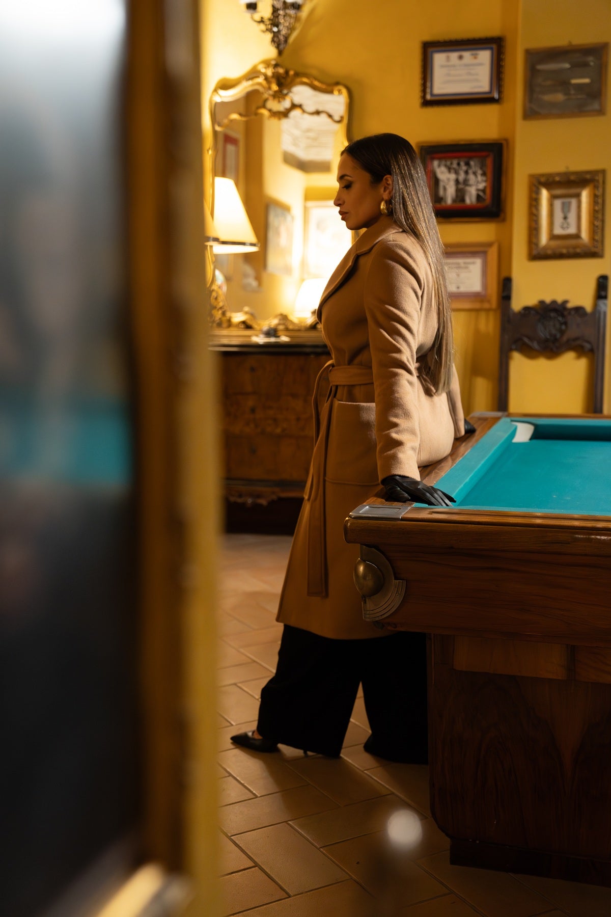 Cappotto monopetto, collo a revers, tasche sul davanti, cintura in vita, spacchi laterali, foderato.