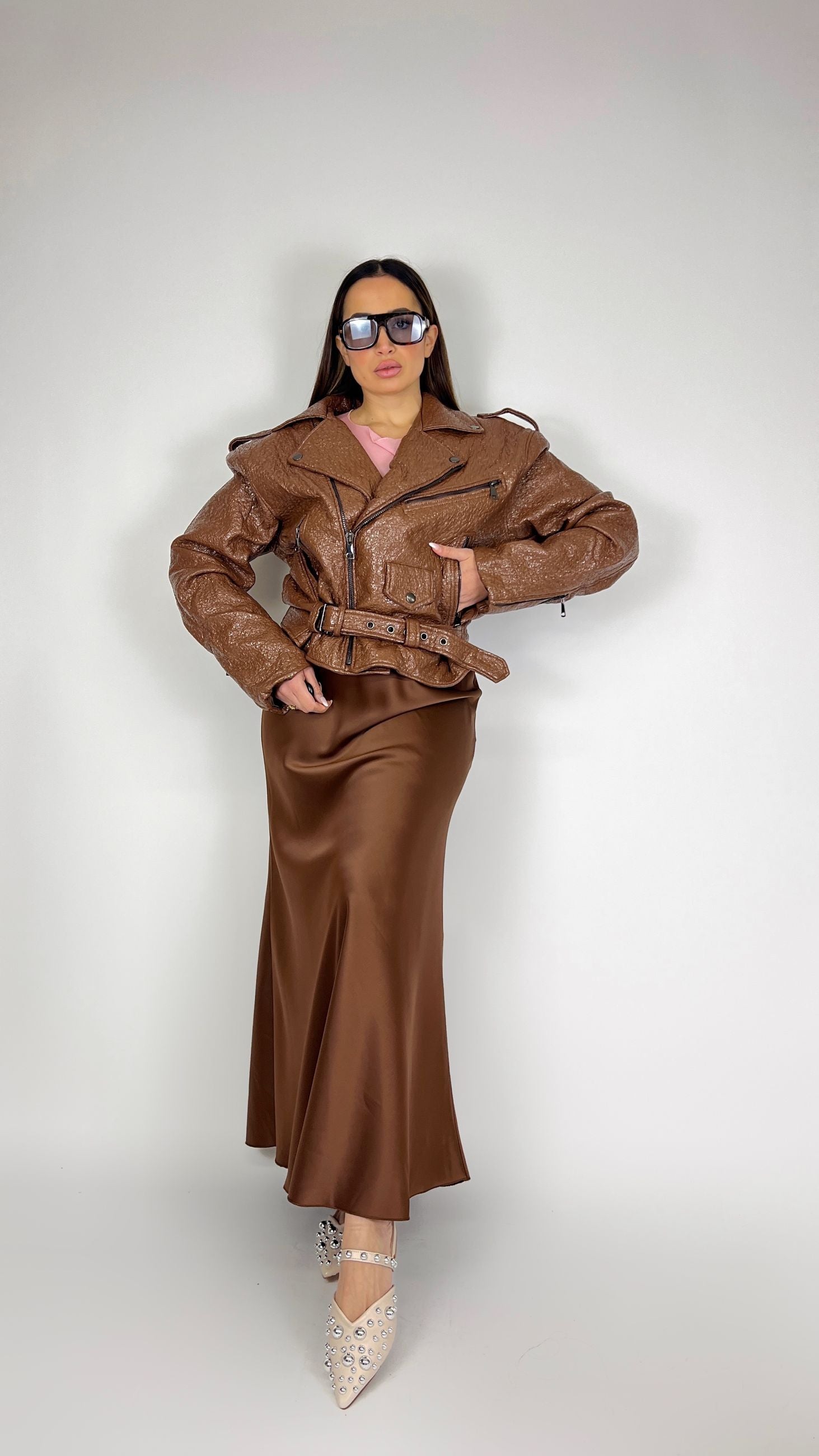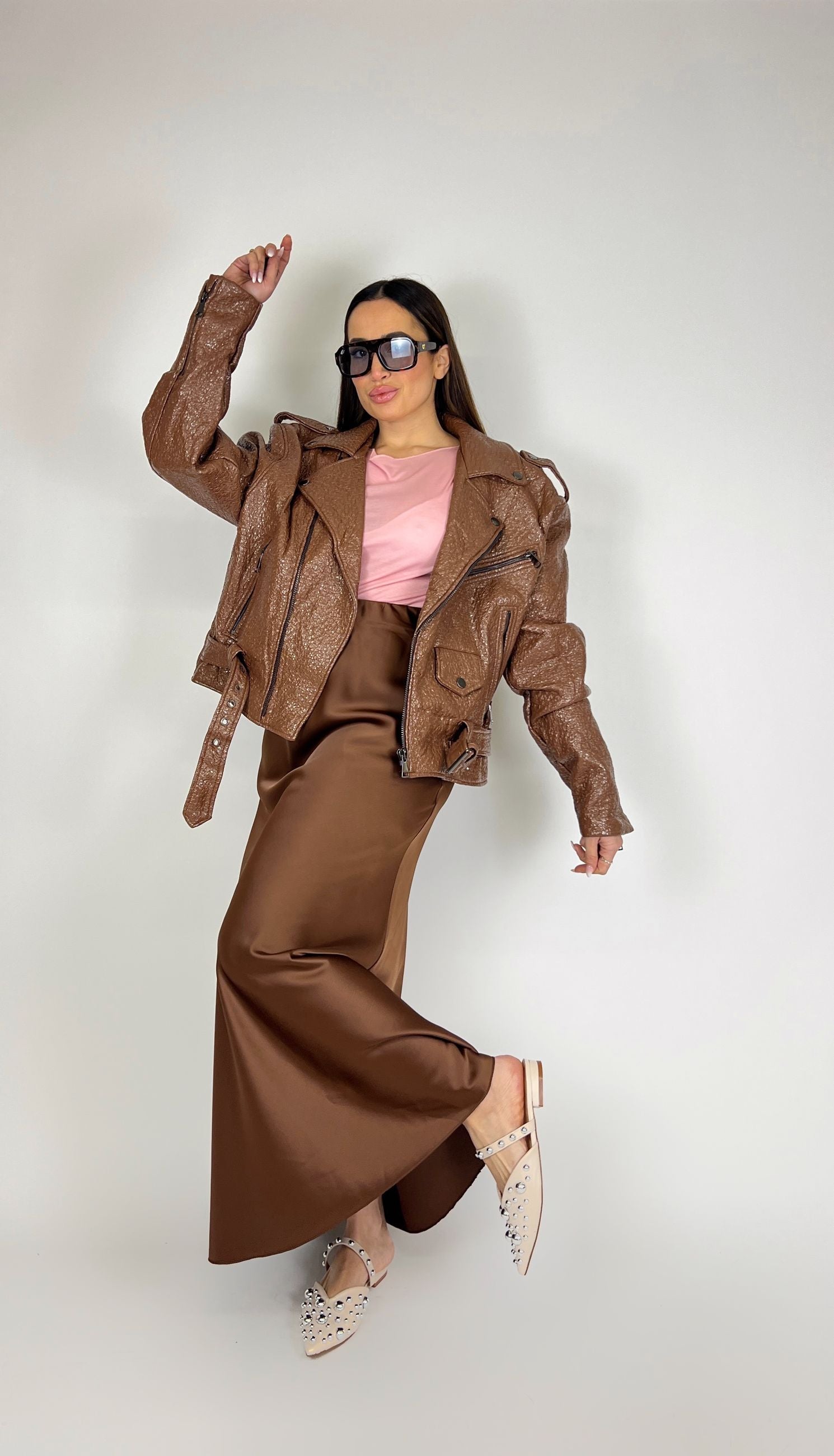 Giacca biker in ecopelle con scollo a revers, fodera interna. Presenta tre tasche anteriori, chiusura con zip e cintura al fondo.