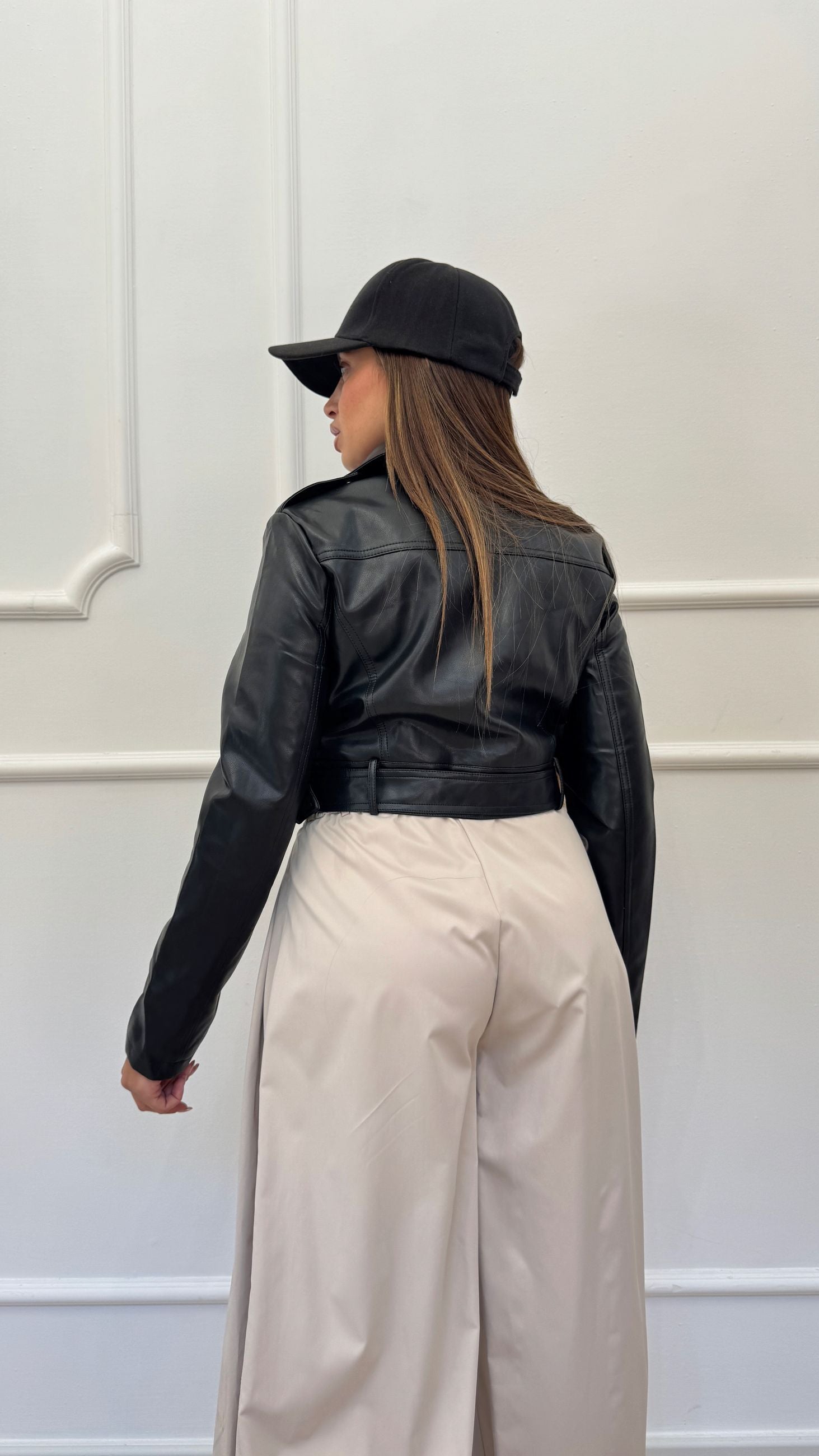 Chiodo in ecopelle cerniera davanti, cintura in vita, dettagli in metallo color argento.