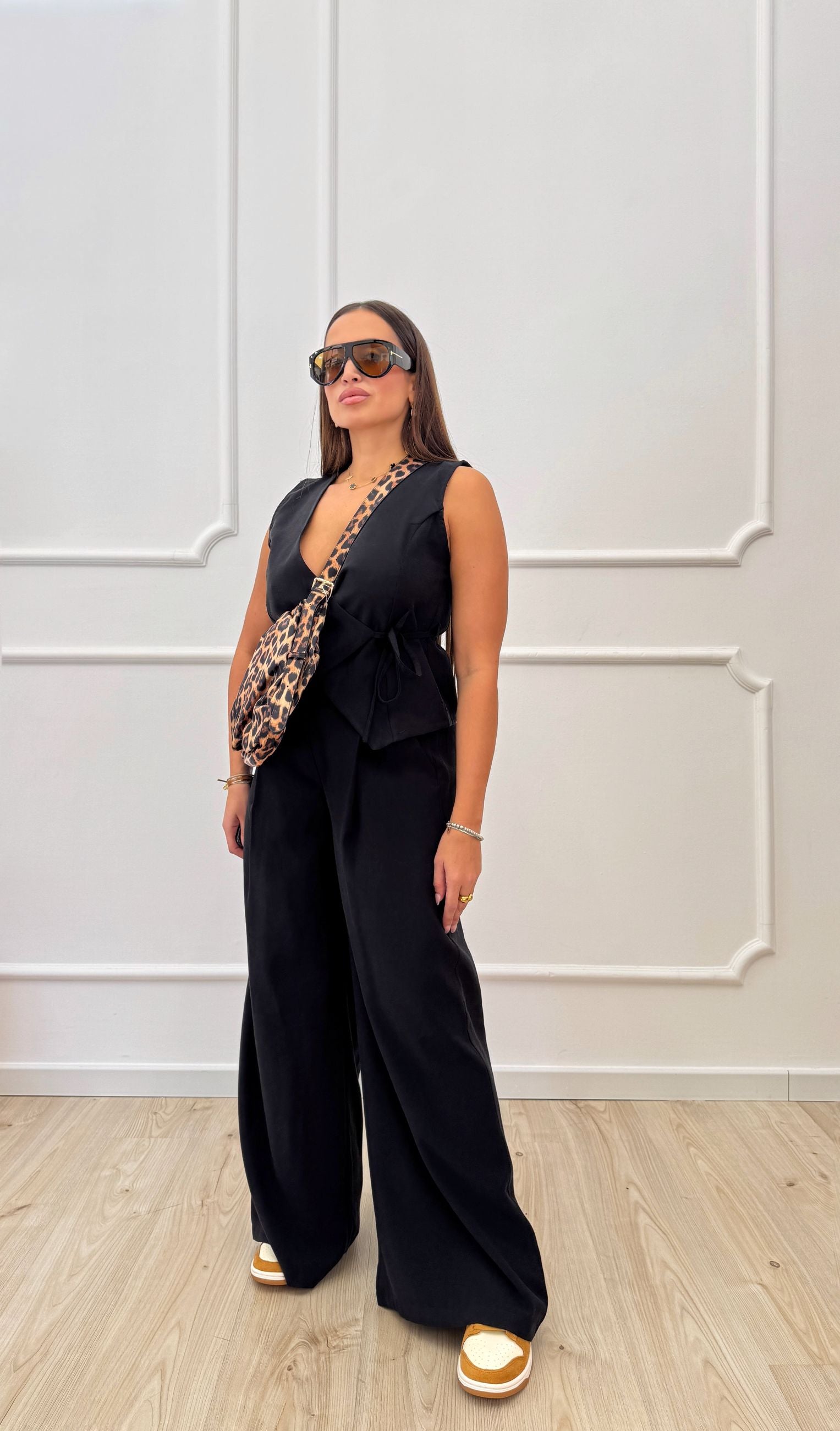 Pantalone palazzo con pences, tasche laterali, elastico sul dietro.