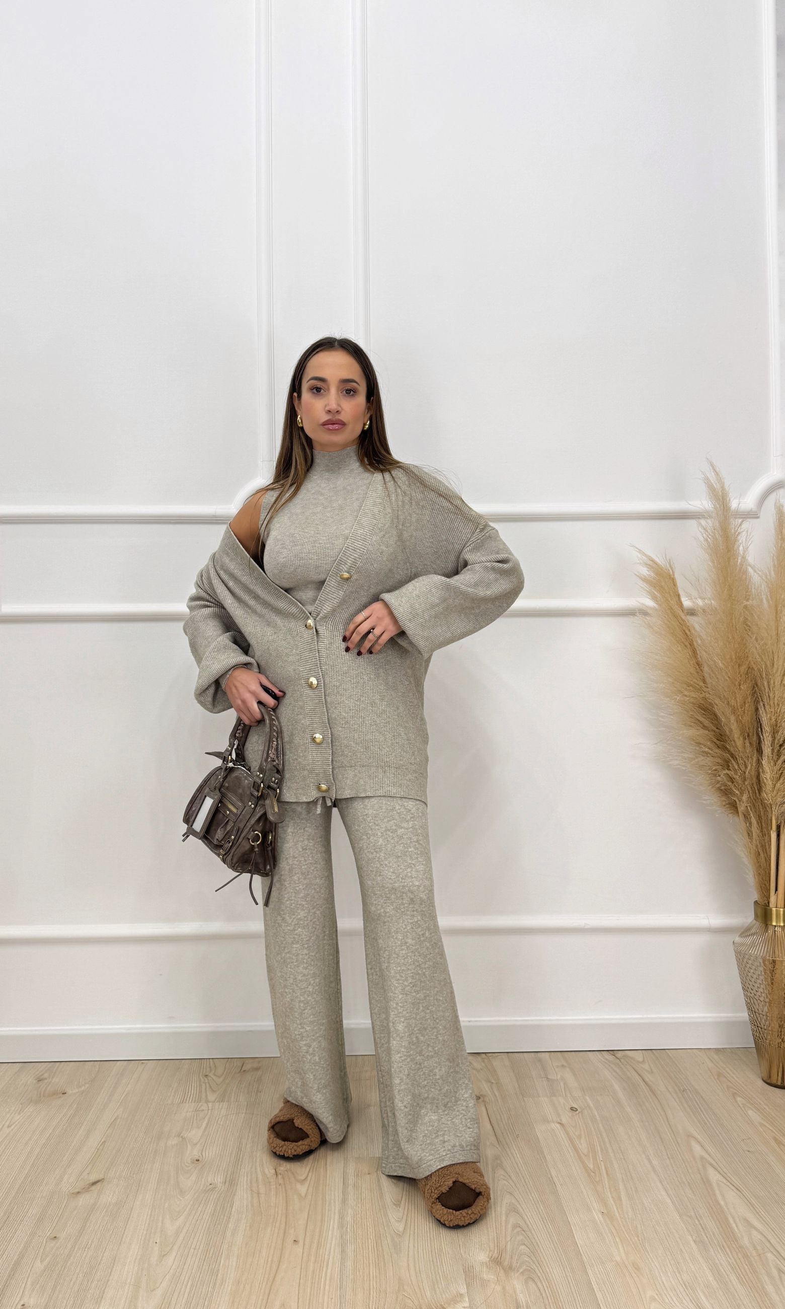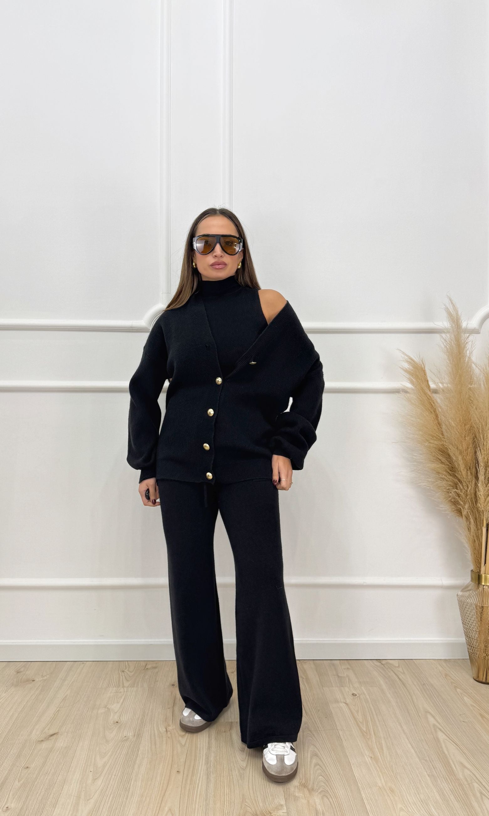 Cardigan ampio con scollo a V, maniche lunghe, bottoni in metallo color oro.