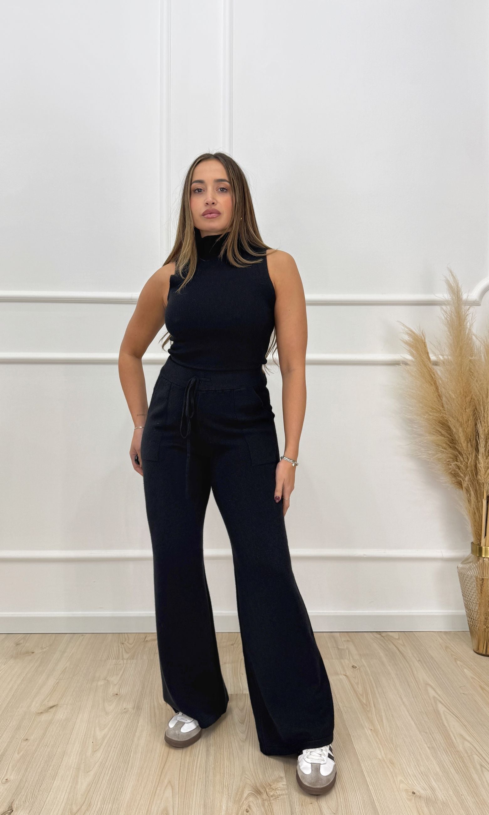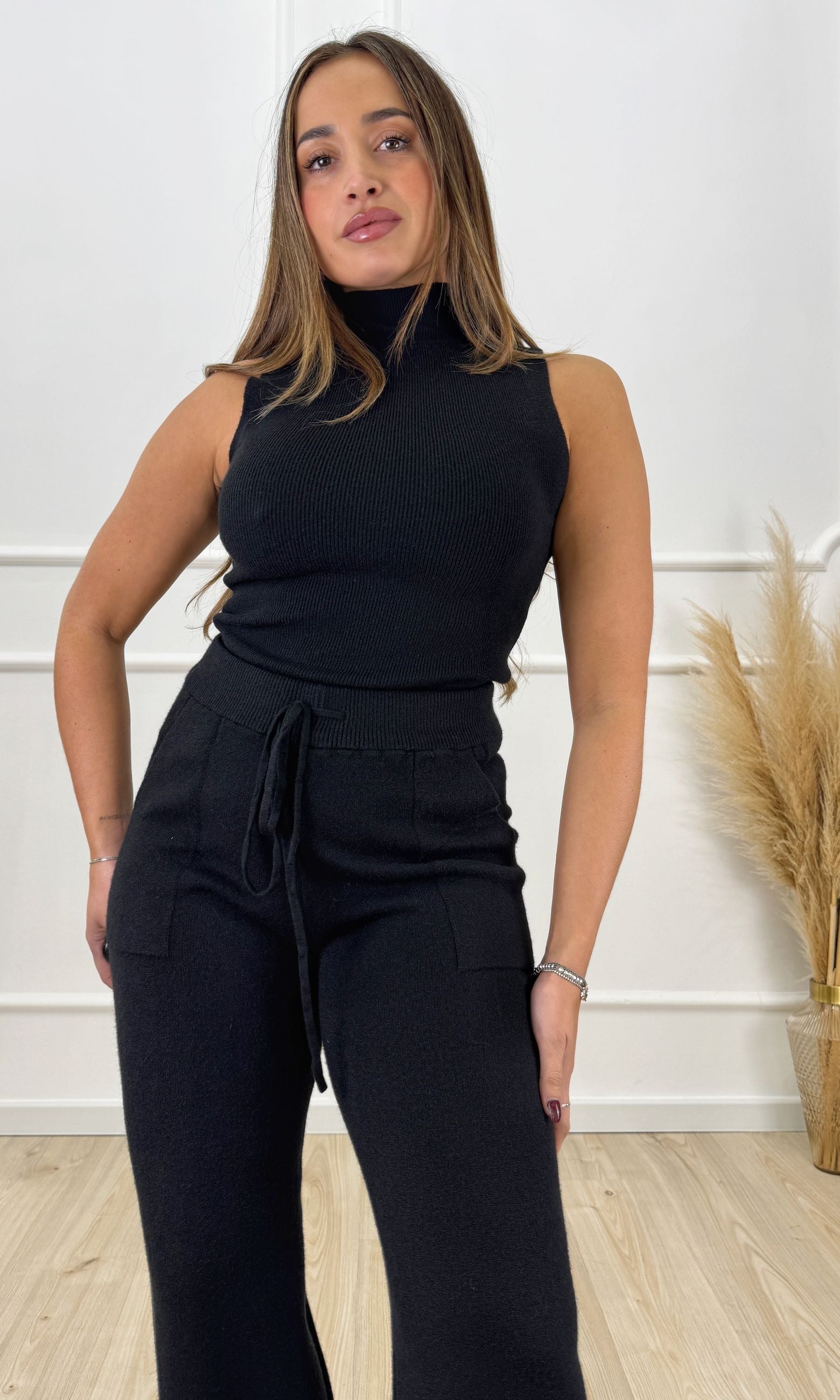 Pantalone palazzo con coulisse in vita, tasche laterali.