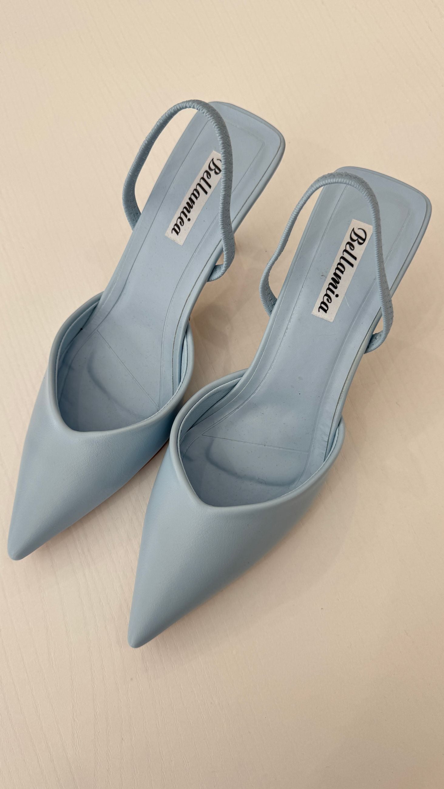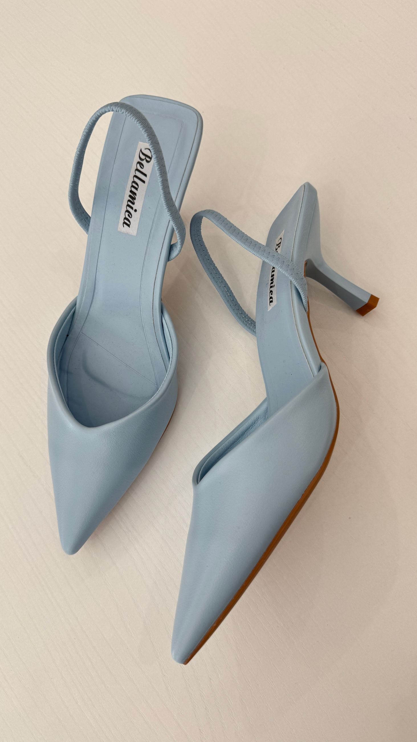 Decolleté aperte dietro in ecopelle, cinturino elastico, tacco 7cm.