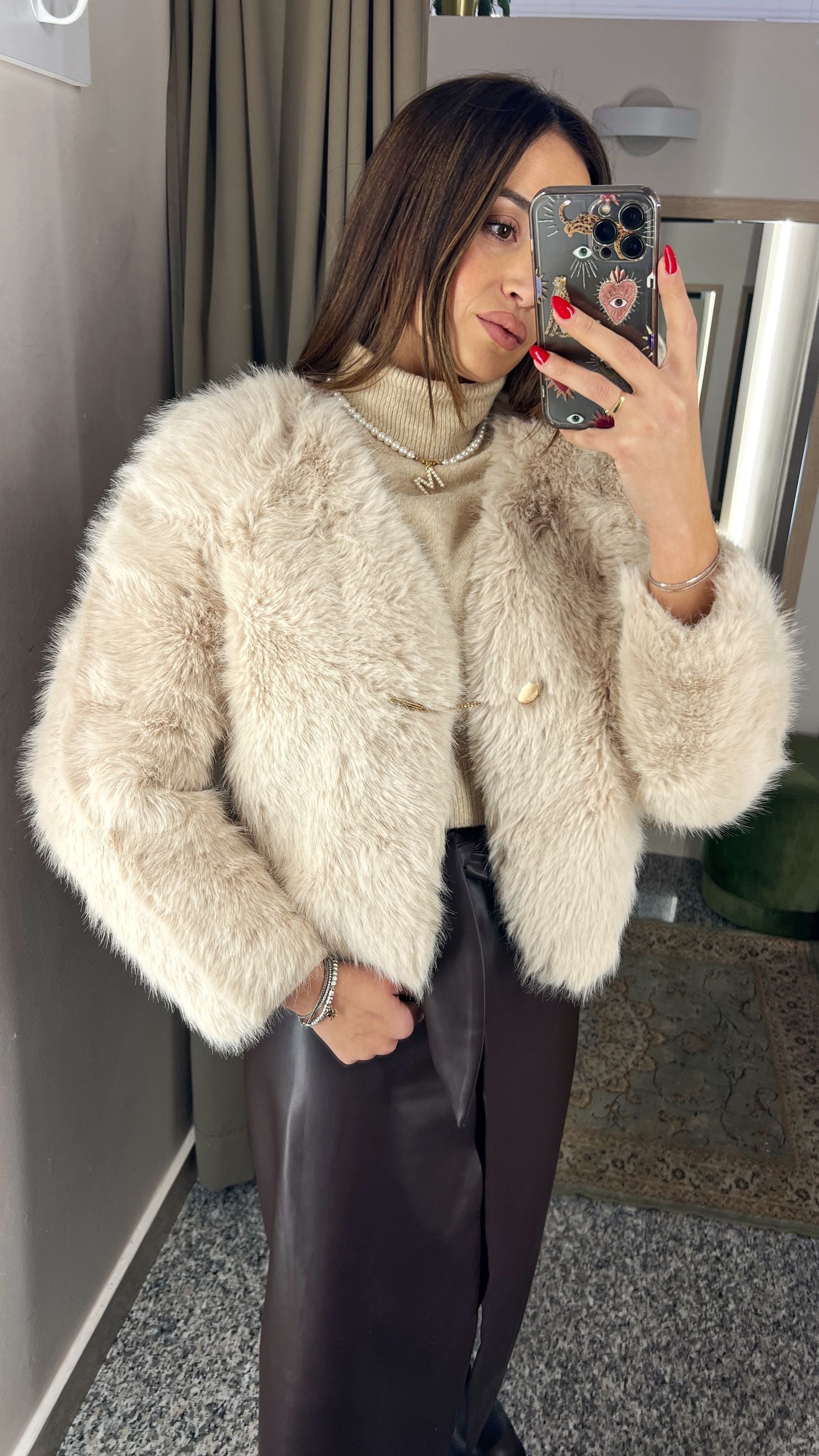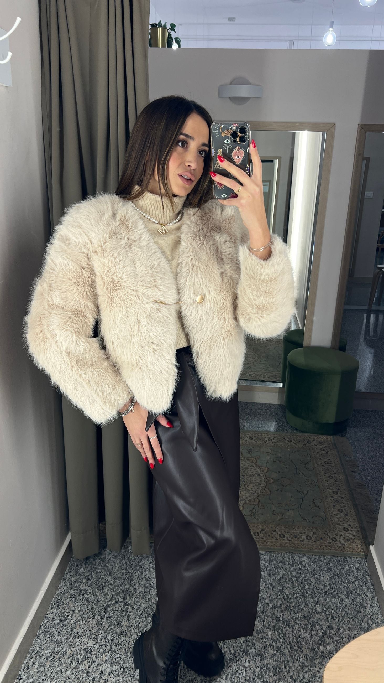 EcoPelliccia senza collo, maniche lunghe, chiusura baciata con catenina, Vestibilità ampia.