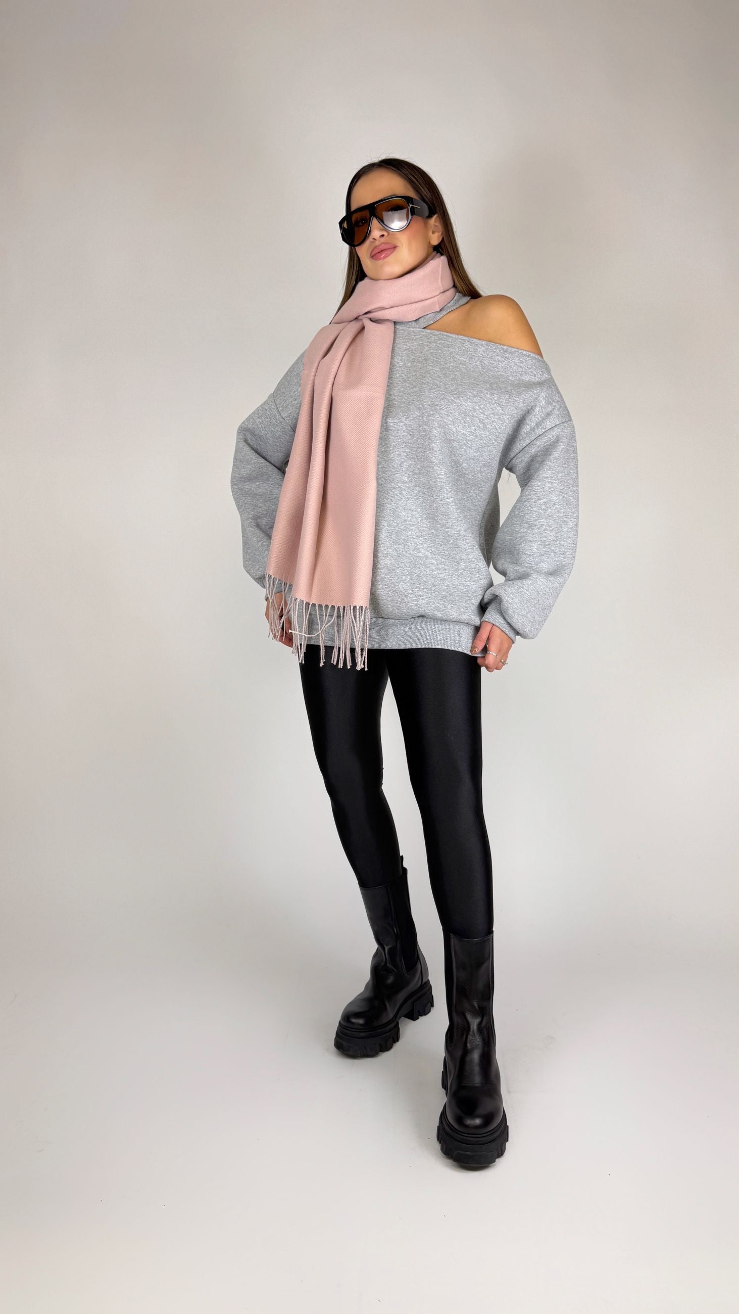 Felpa over felpata all'interno, girocollo con apertura sulla spalla.