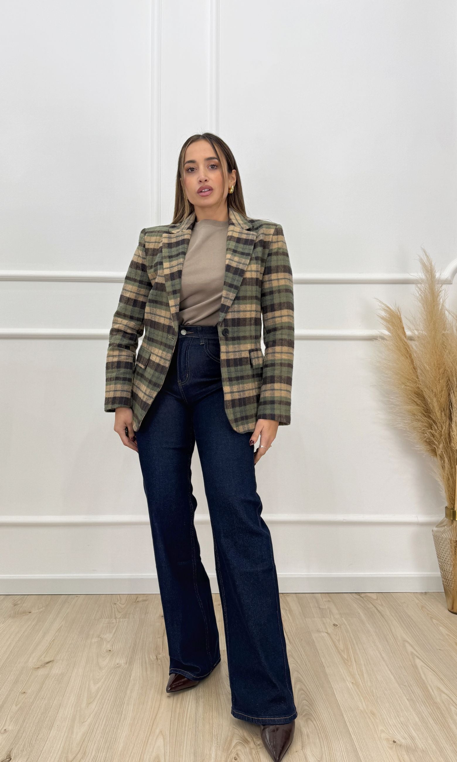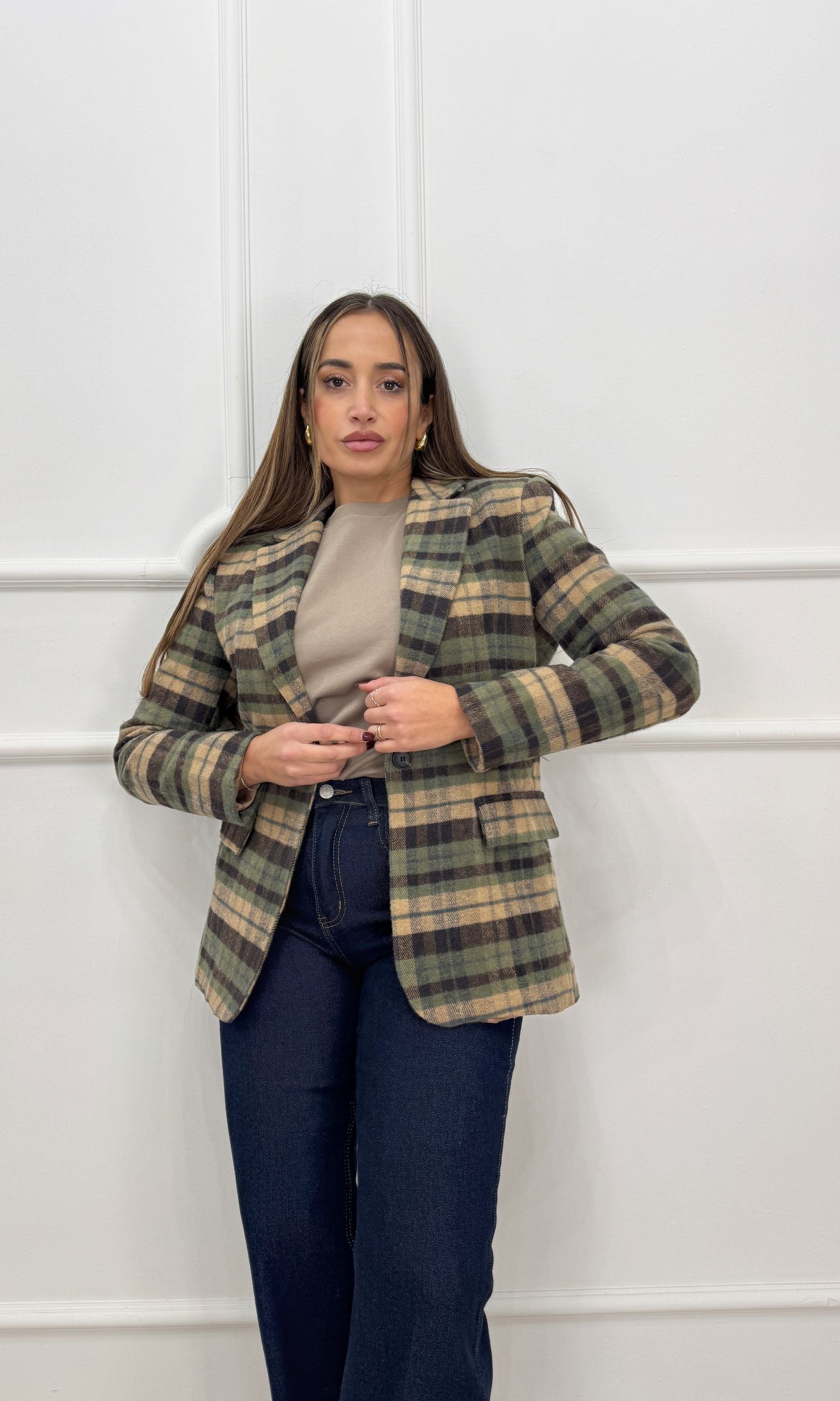 Giacca over in panno a quadri, monopetto, spalline imbottite, tasche finte sul davanti.
