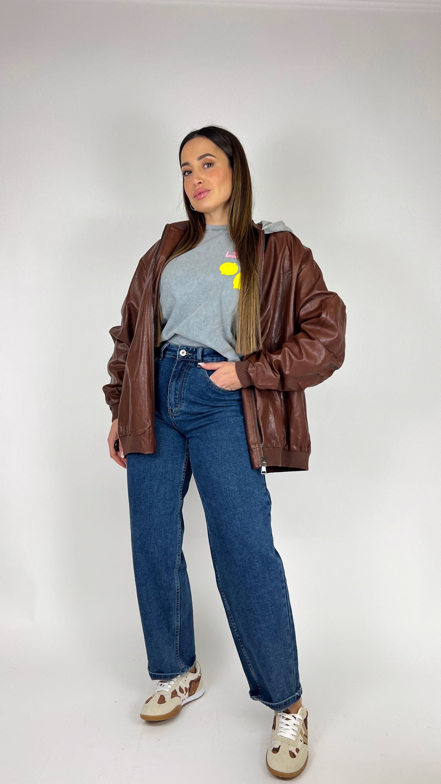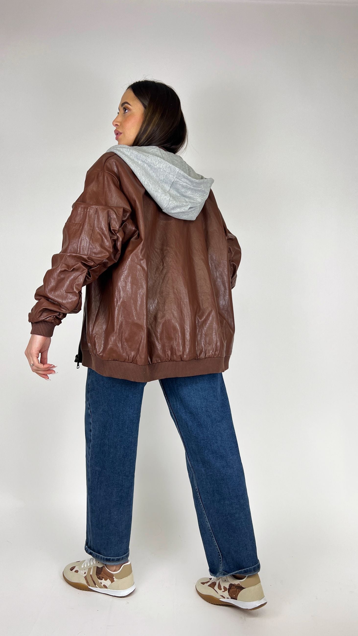 Giacca in ecopelle con cappuccio in cotone a contrasto. Presenta finiture elasticizzate a coste. Due tasche anteriori. Maniche lunghe. Chiusura frontale con zip. Fodera interna.
