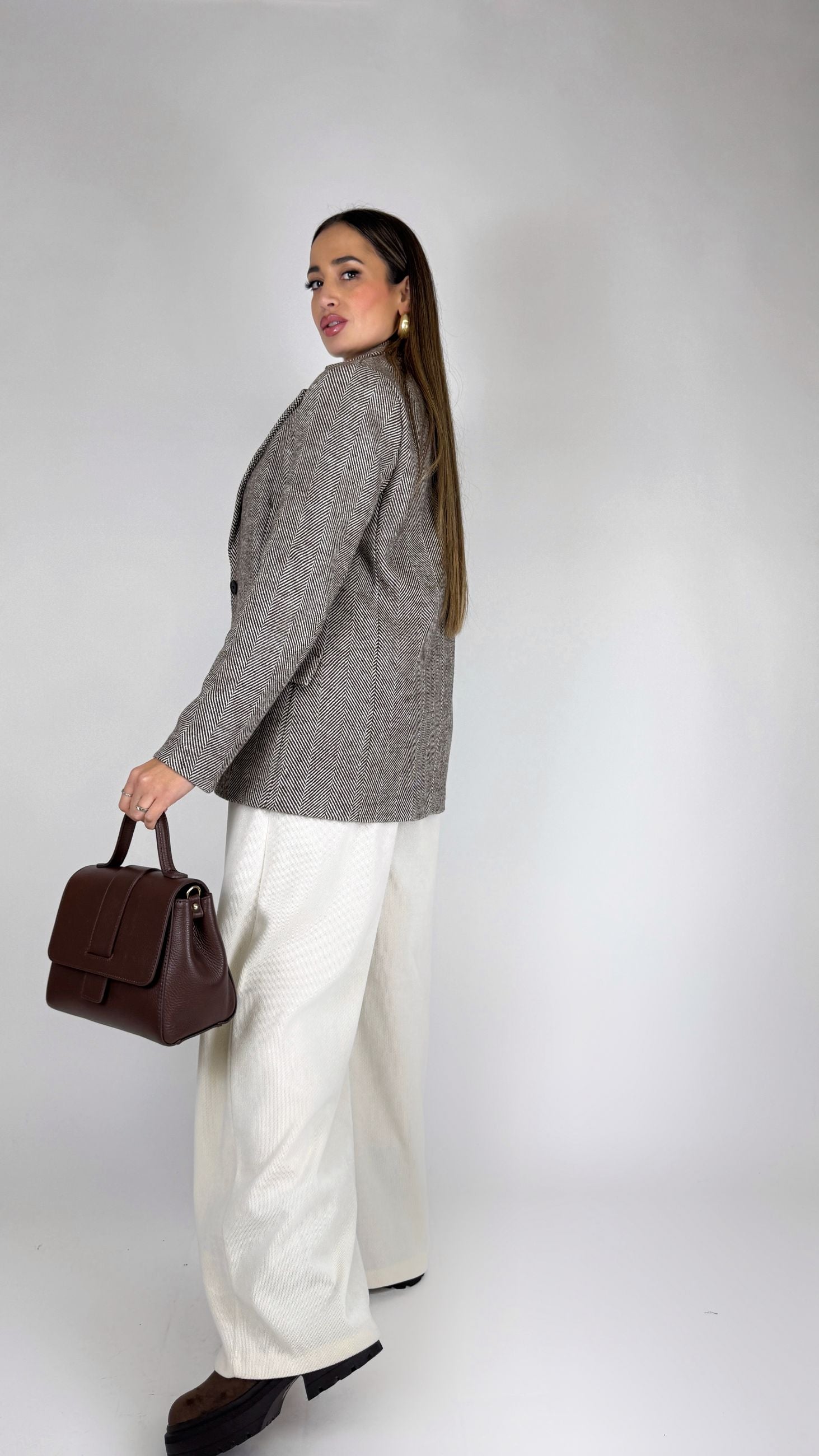 Giacca over in panno spigato, monopetto, spalline imbottite, tasche finte sul davanti.
