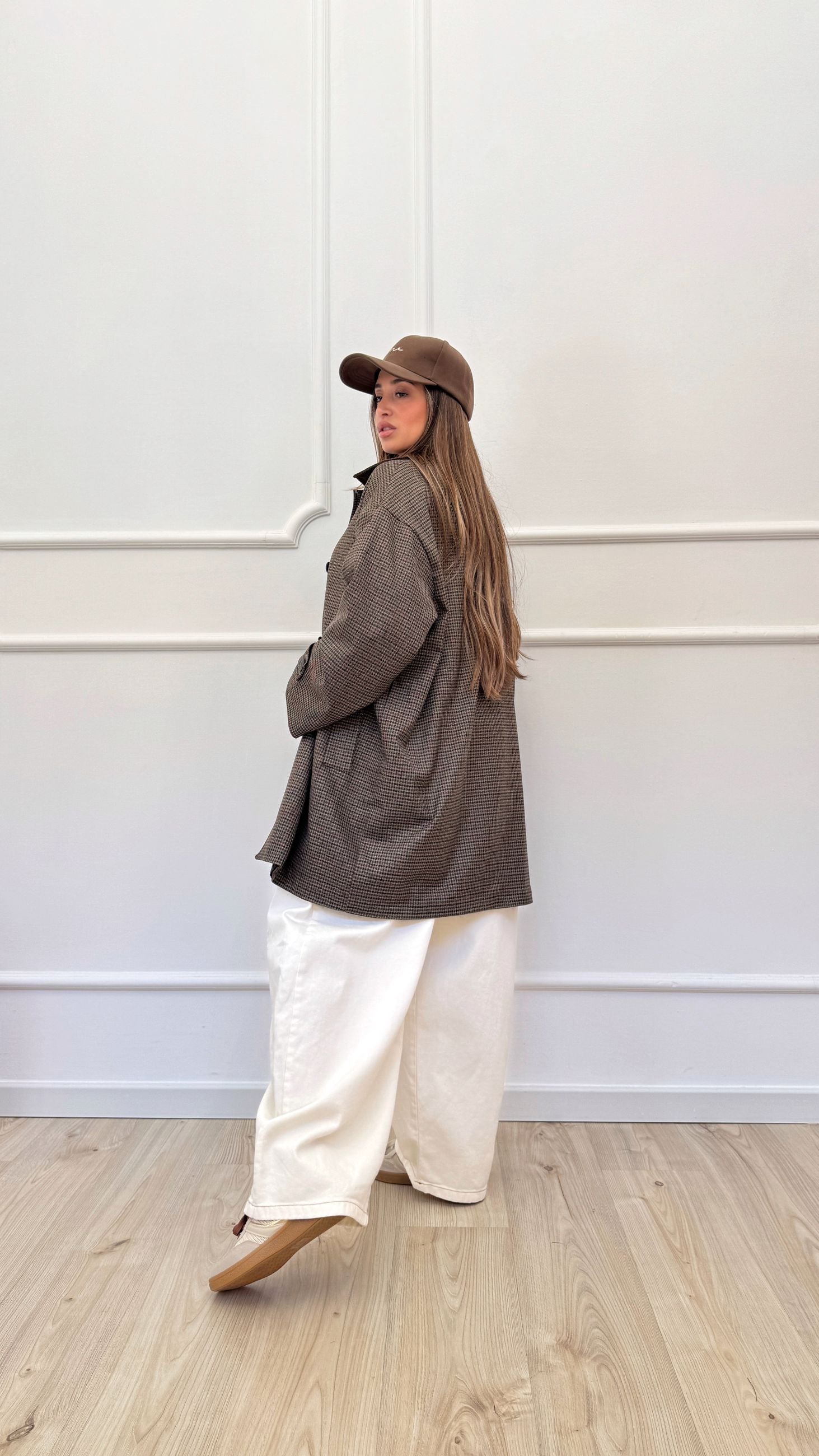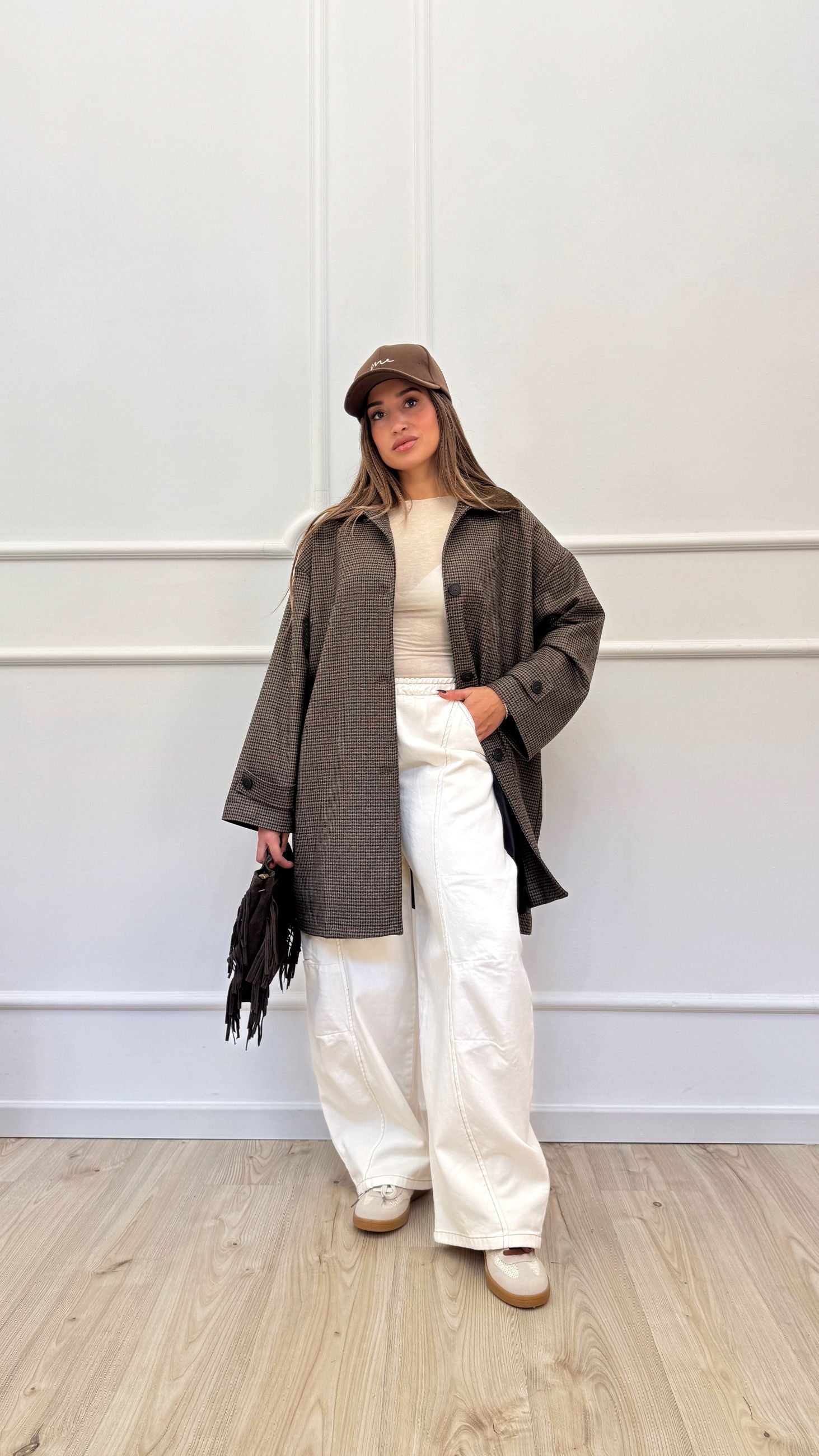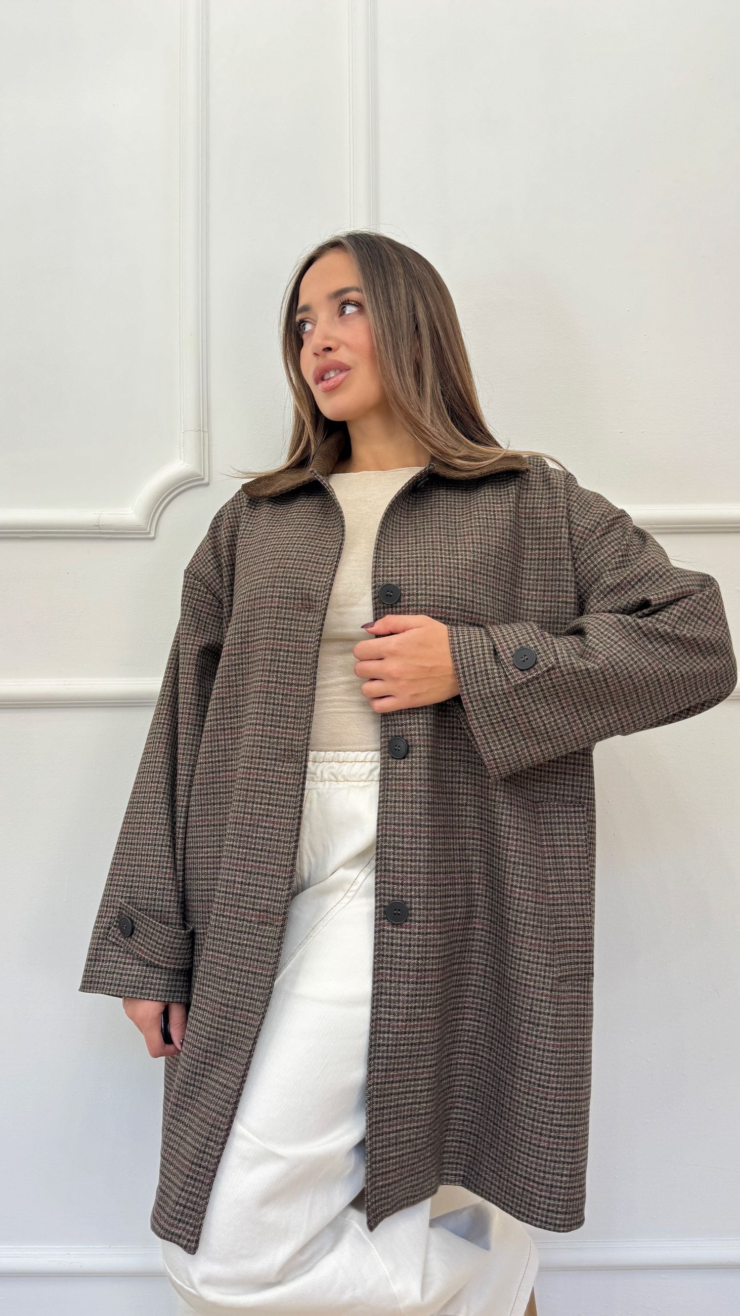 Giaccone a quadretti a sacco, collo in velluto a cosine, dettaglio alla manica, tasche davanti.