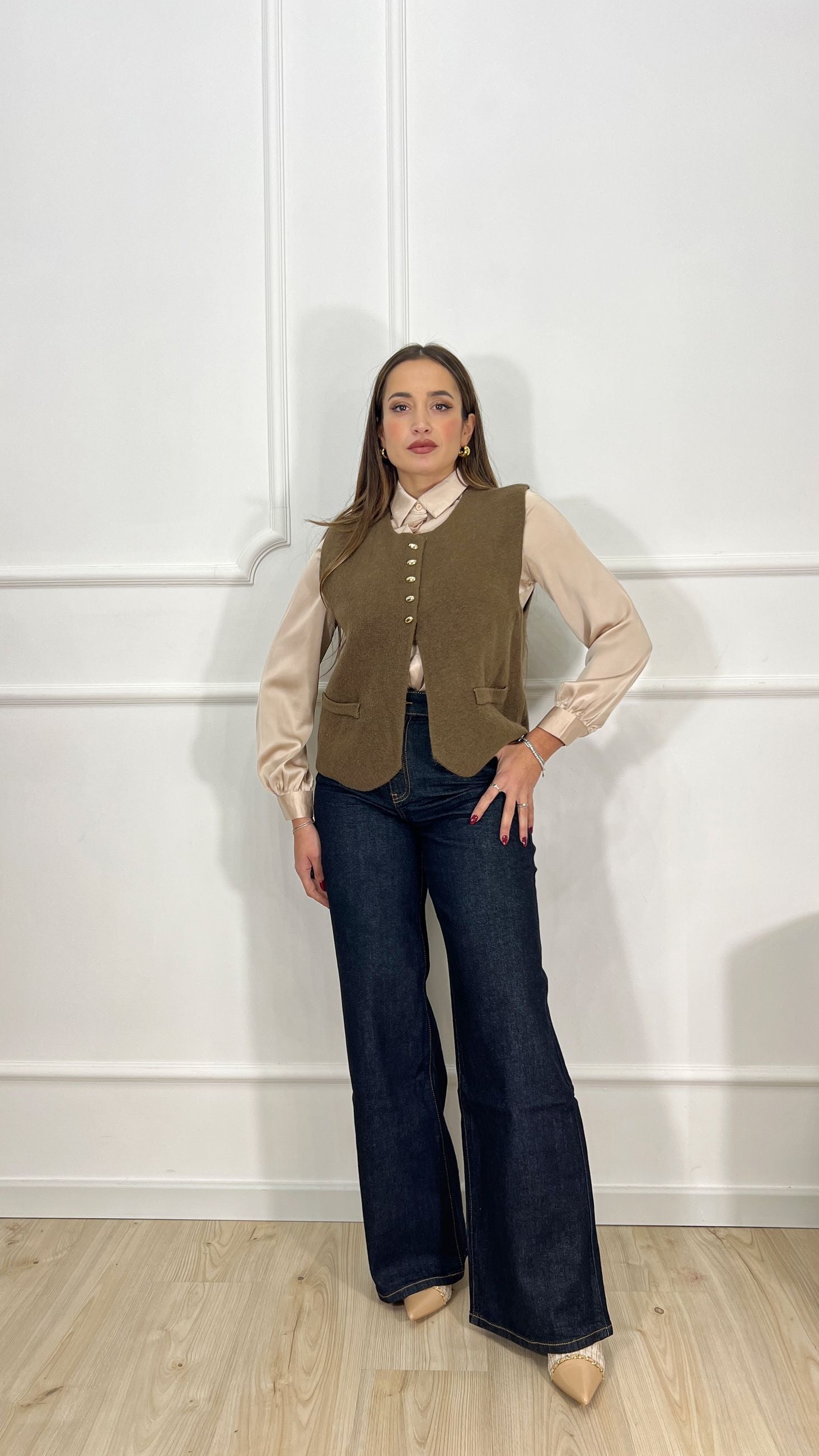 Gilet in maglina, girocollo, bottoni solo nella parte alta, tasche finte davanti.