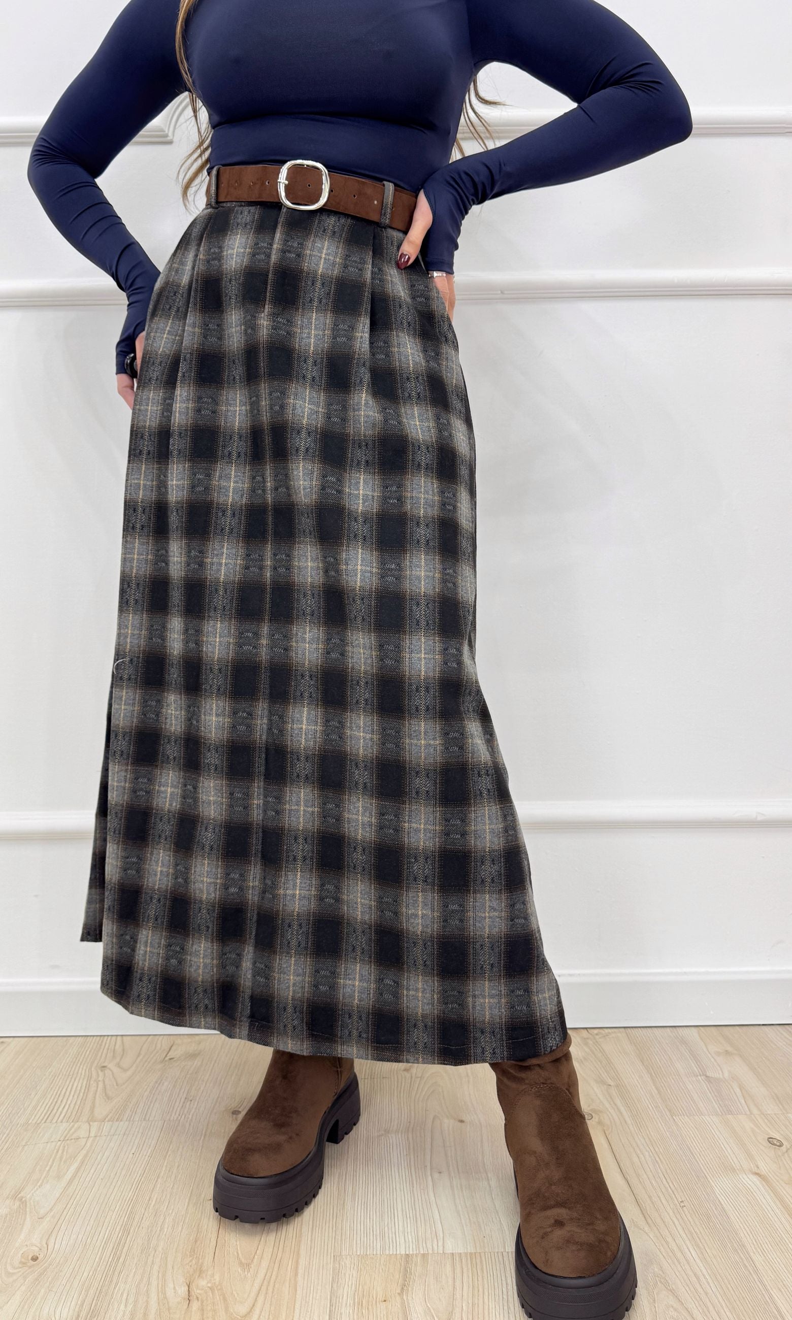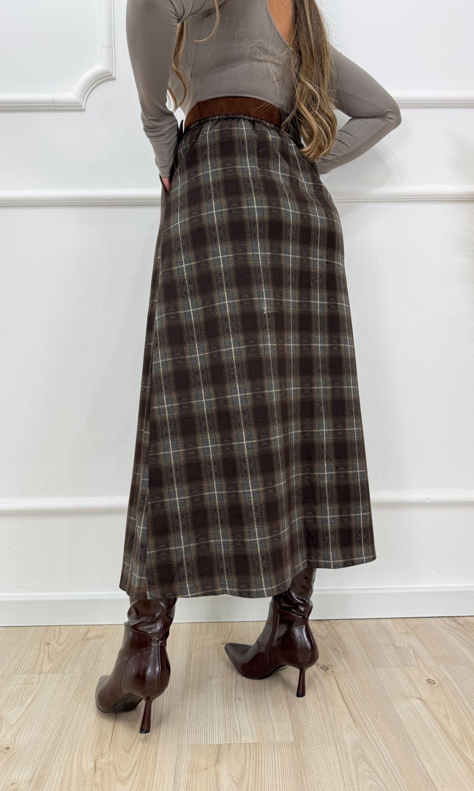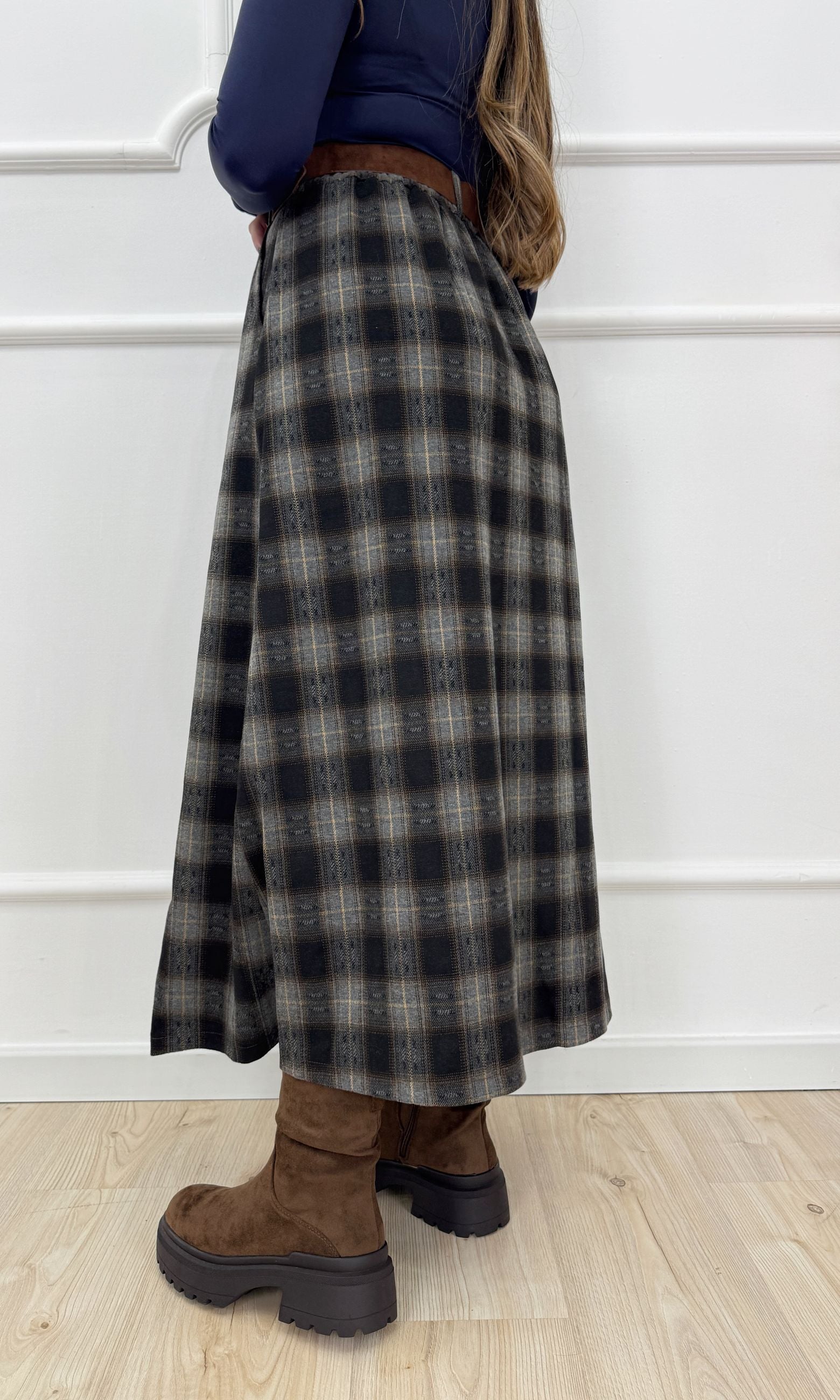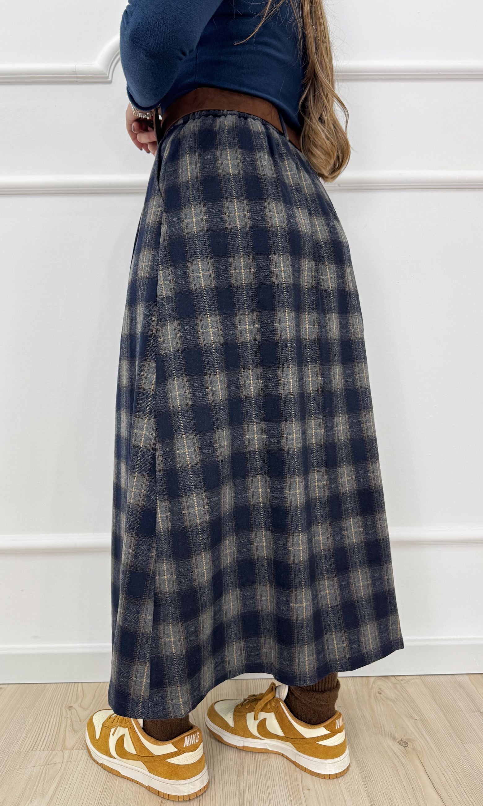 Gonna a quadri in flanella svasata, tasche laterali, elastico sul dietro, pences sul davanti.