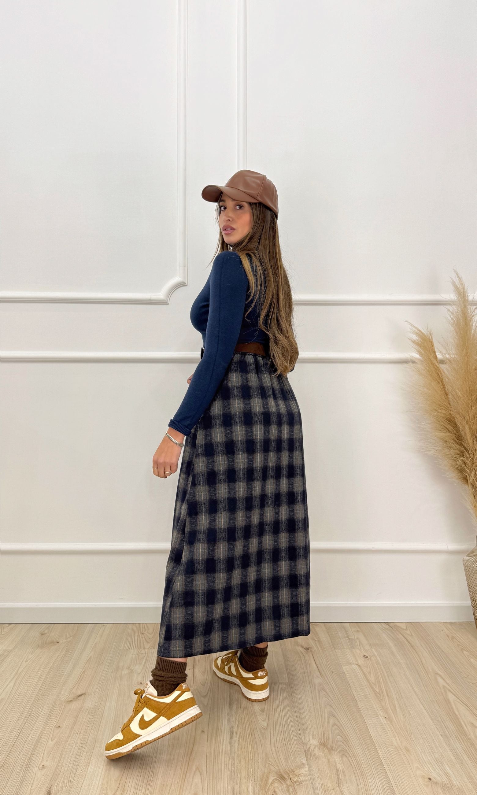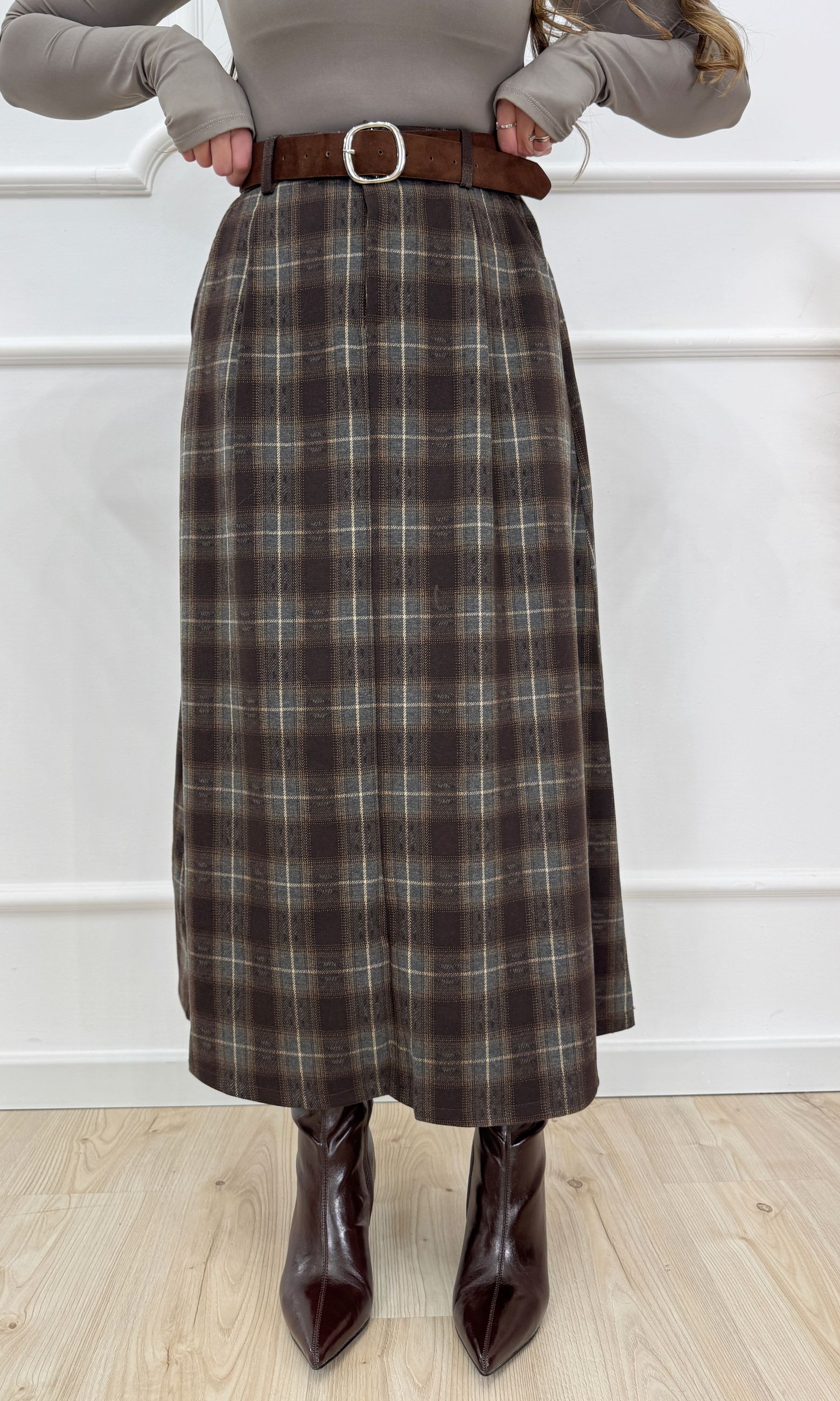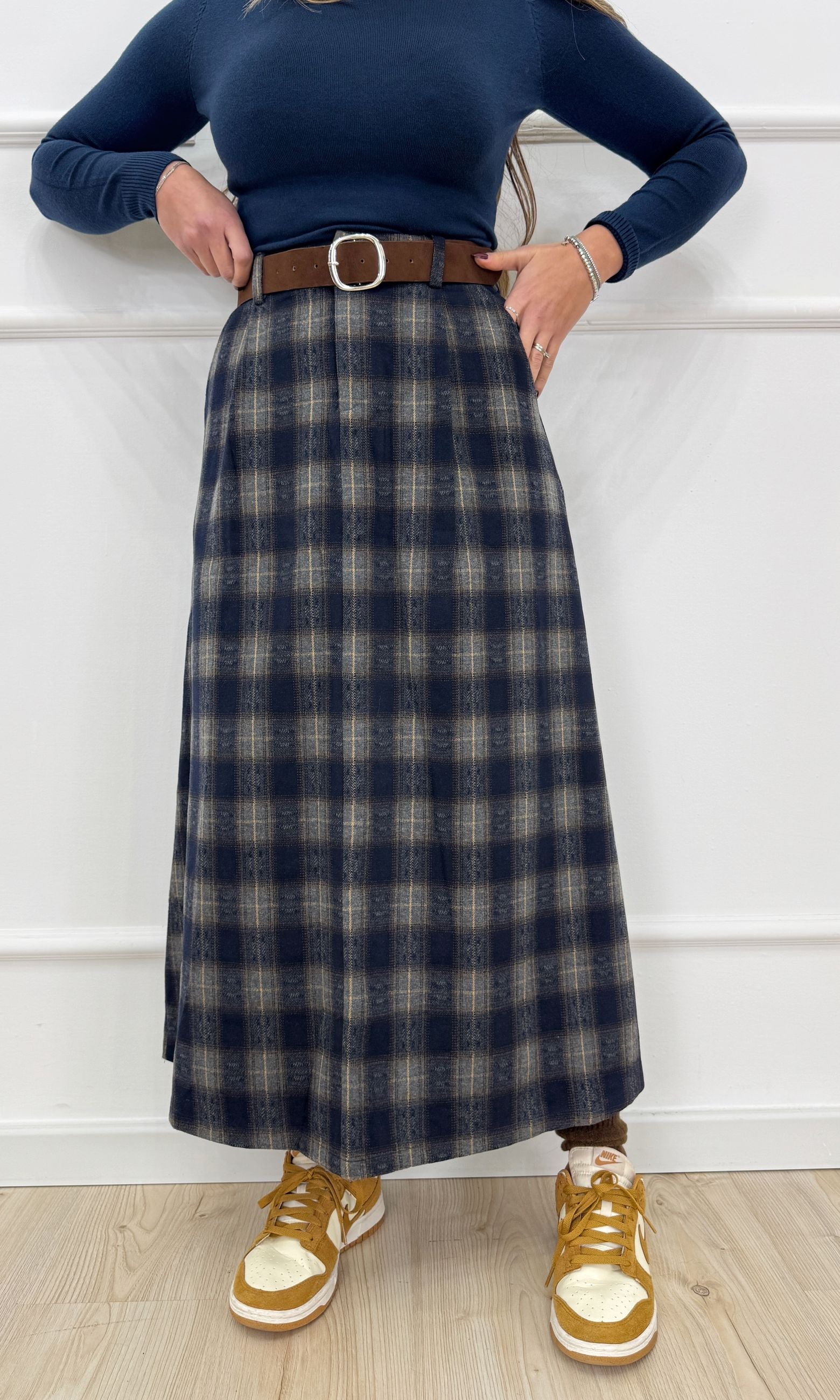 Gonna a quadri in flanella svasata, tasche laterali, elastico sul dietro, pences sul davanti.