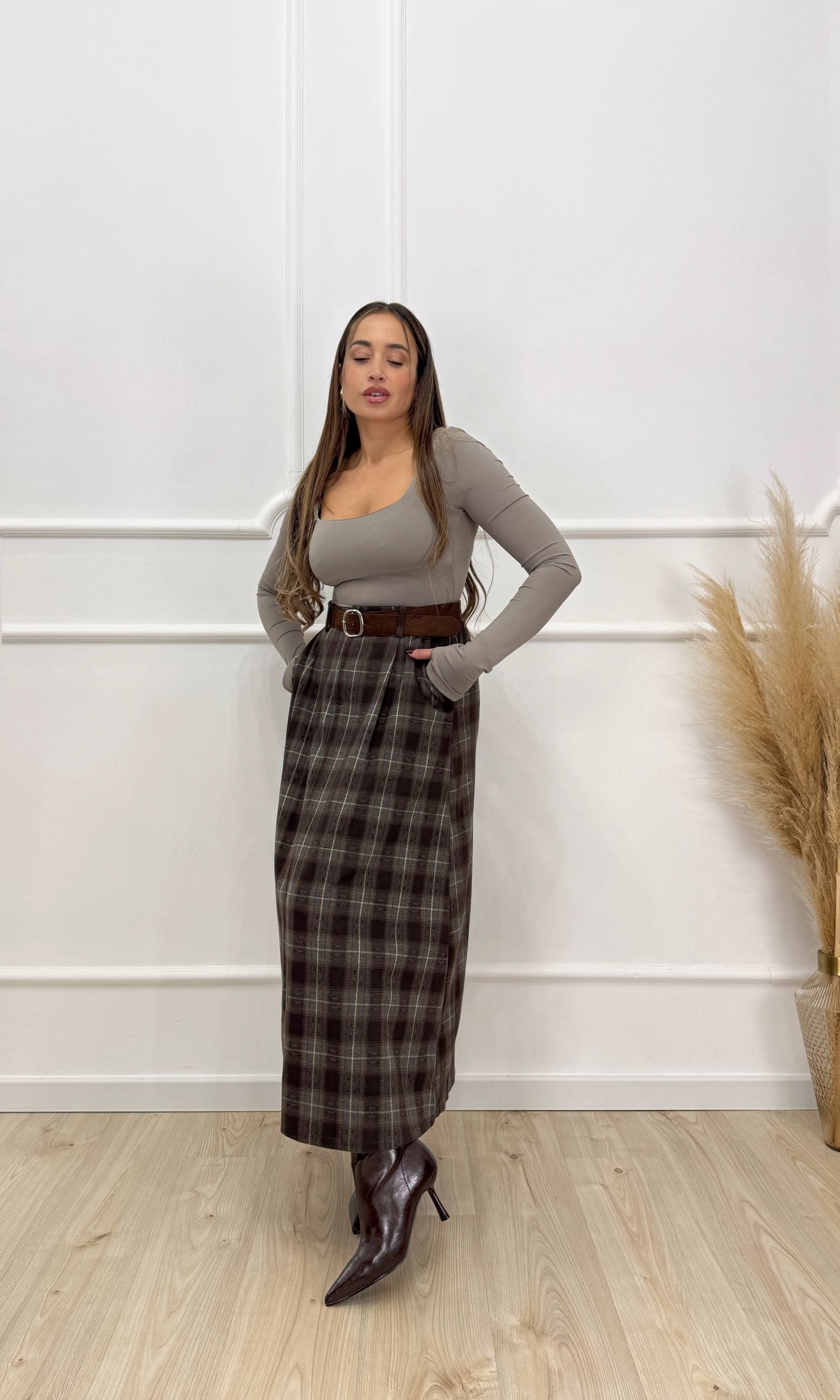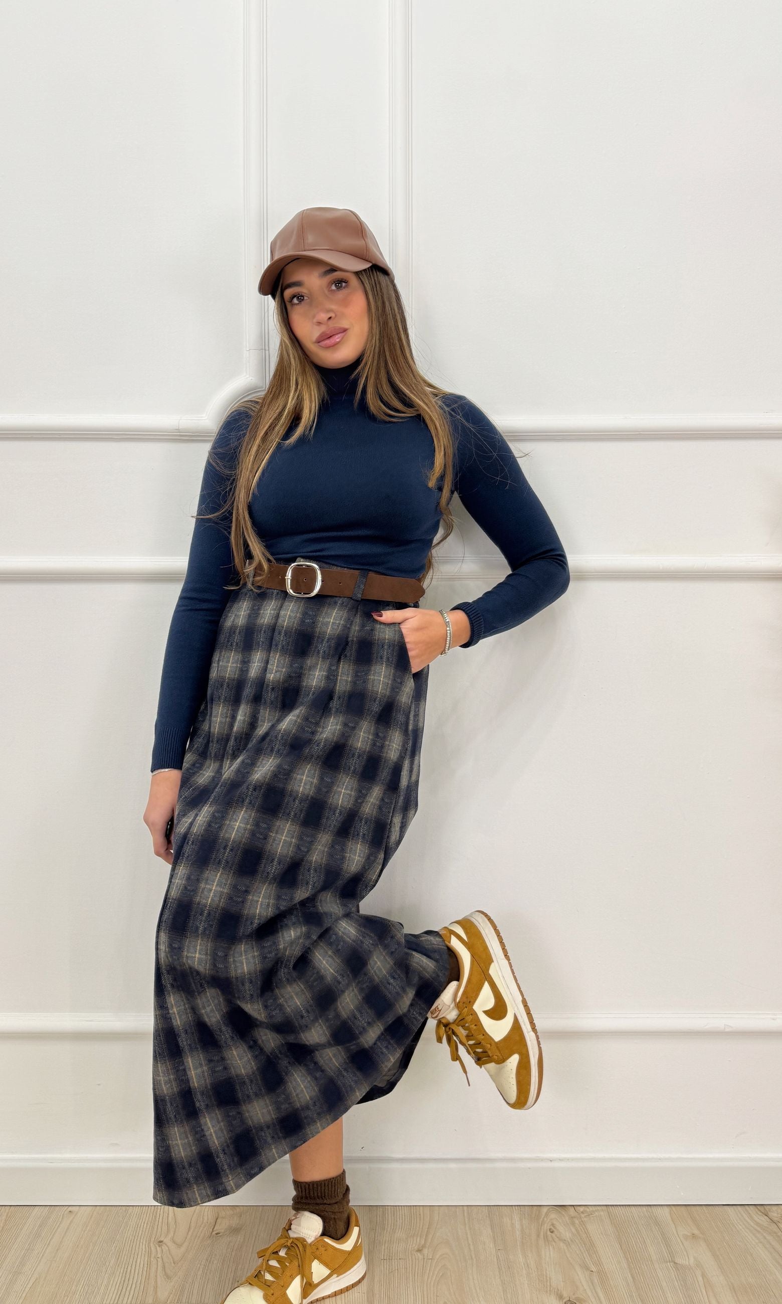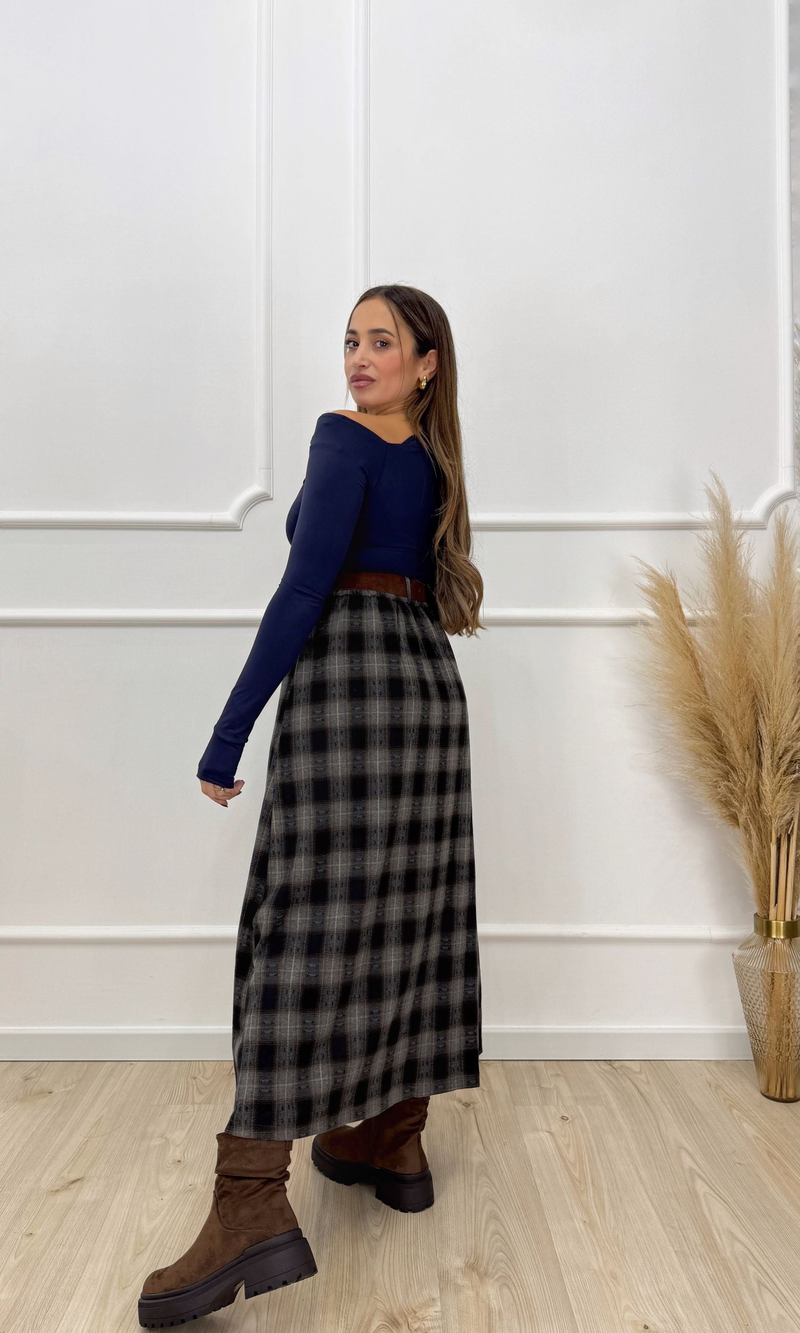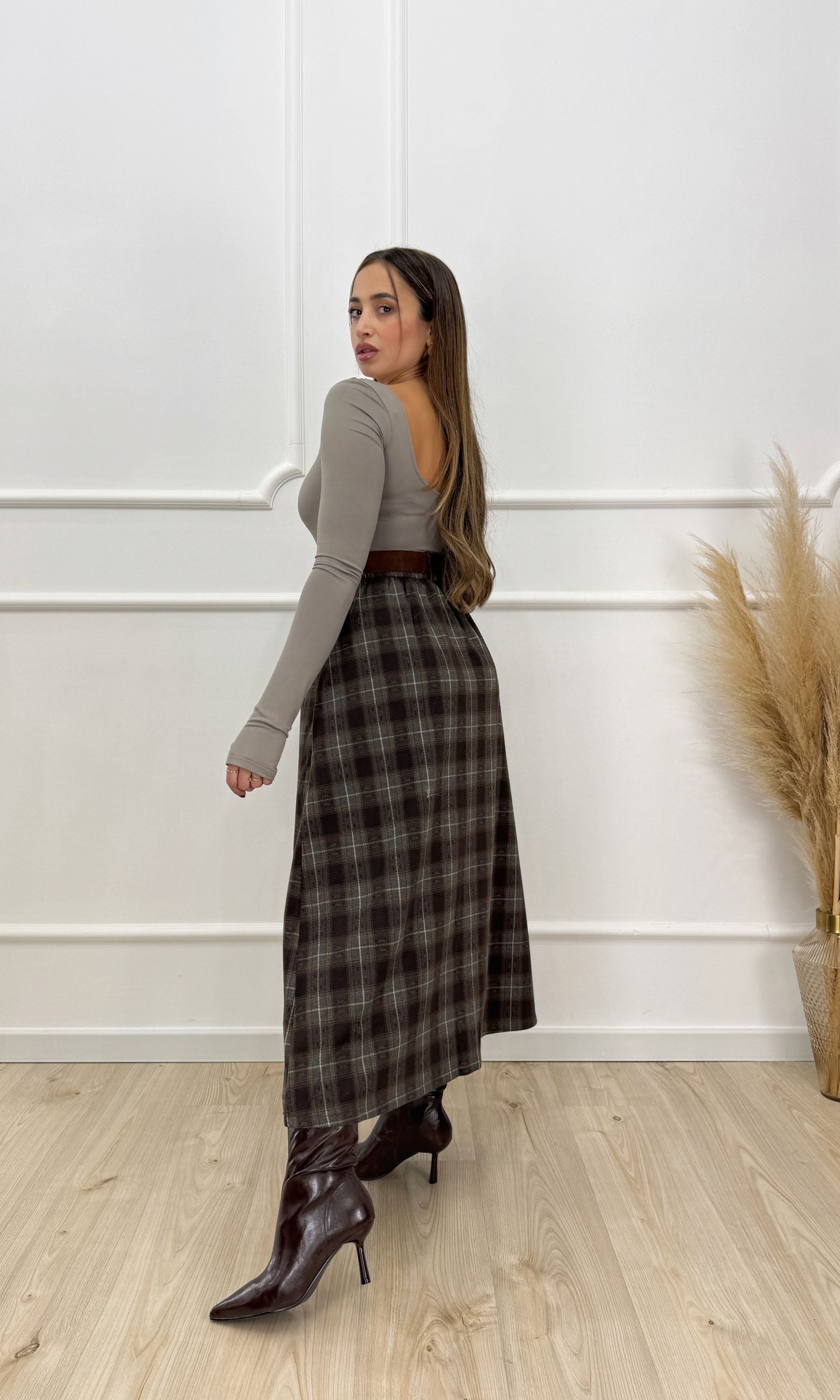 Gonna a quadri in flanella svasata, tasche laterali, elastico sul dietro, pences sul davanti.