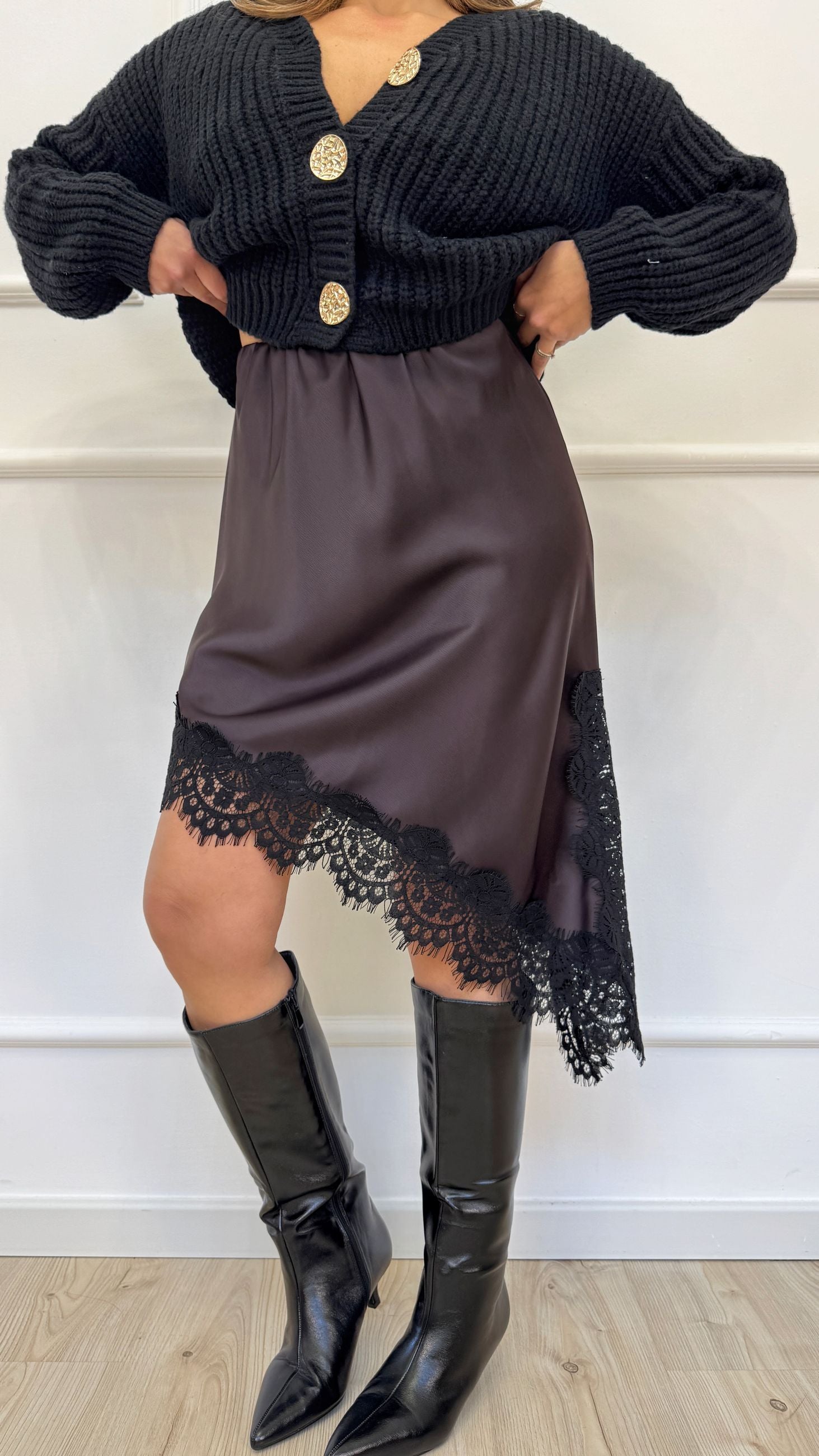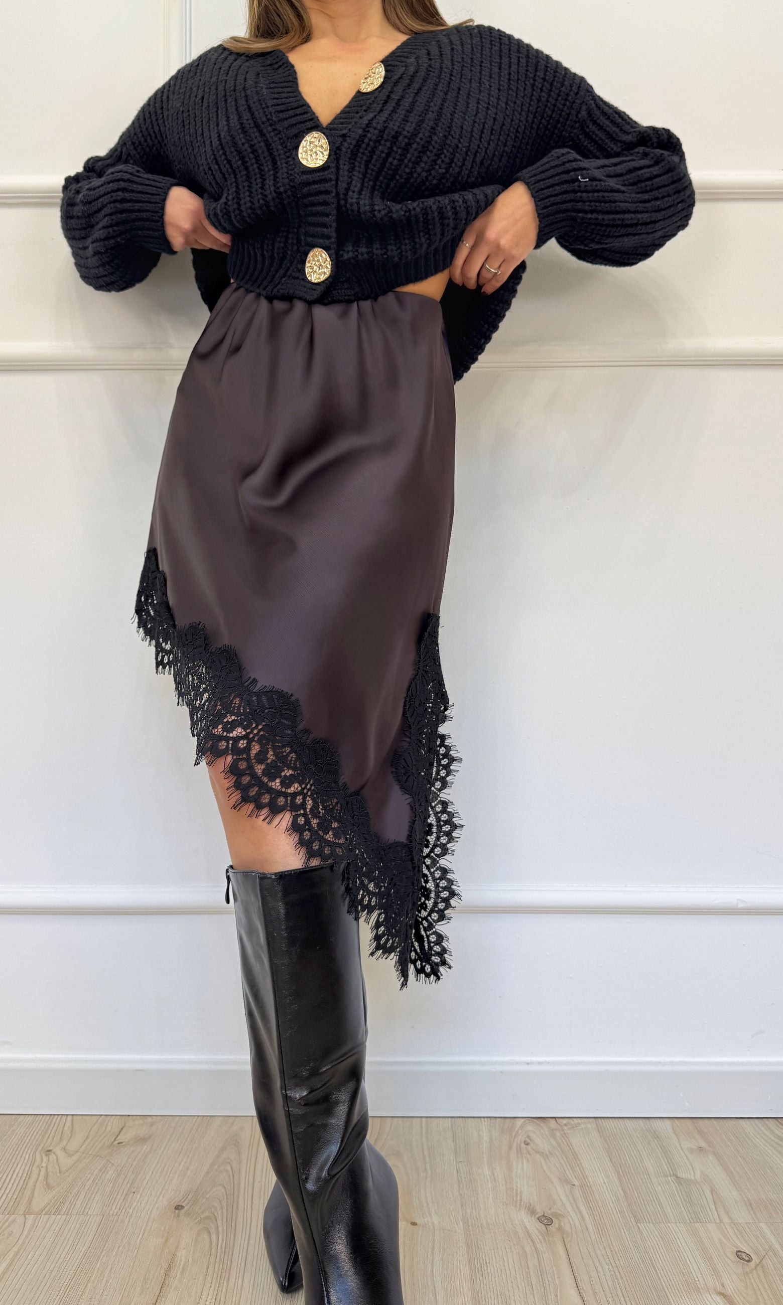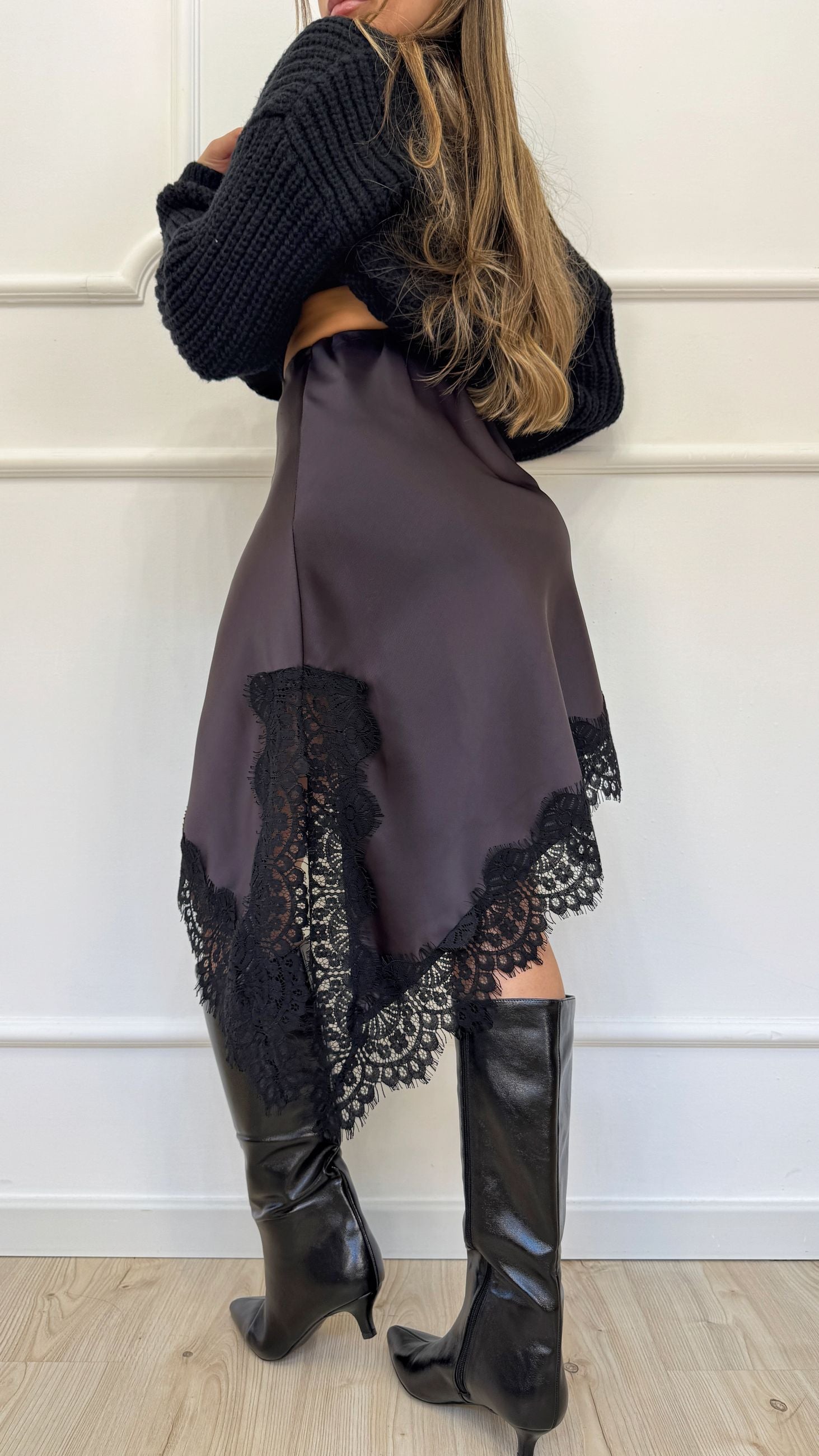 Gonna in saten taglio asimmetrico, pizzo al fondo, elastico in vita.