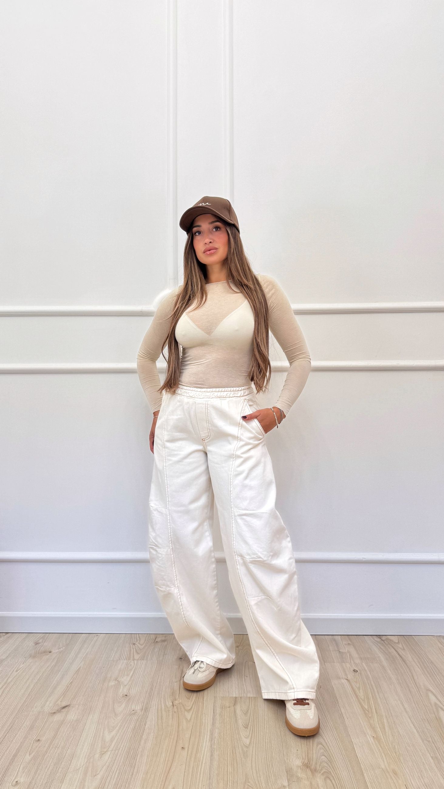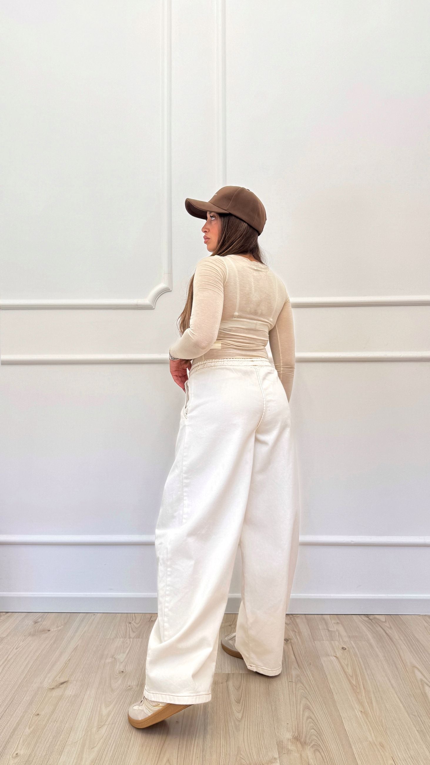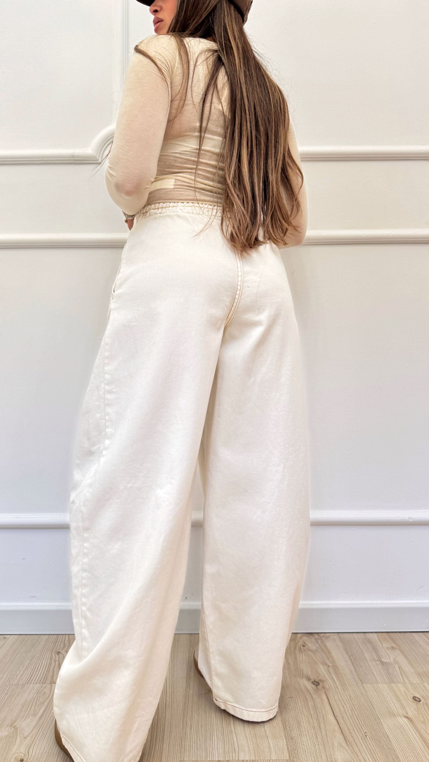 Jeans Balloon, elastico in vita, tasche laterali, tessuto non elastico, impunture in contrasto colore.