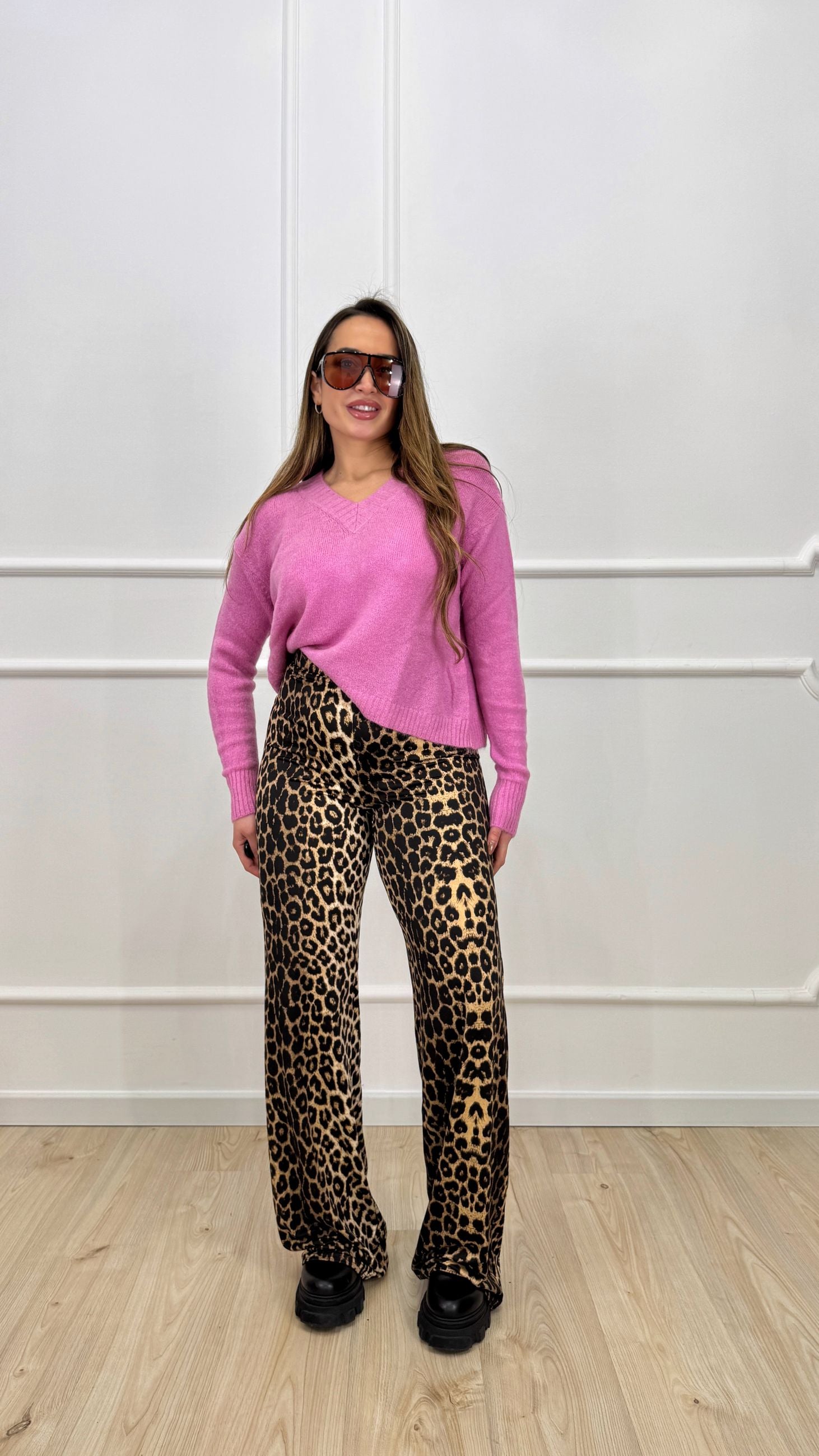 Maglioncino ampio, lunghezza vita, scollo a V, spalle cadenti.