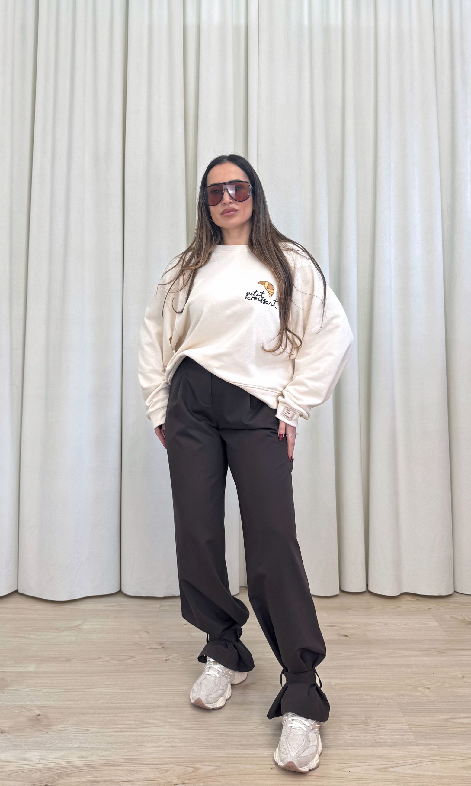 Pantalone con pences, tasche laterali ed elastico sul dietro, vestibilità ampia con dettaglio fibbia alla caviglia.