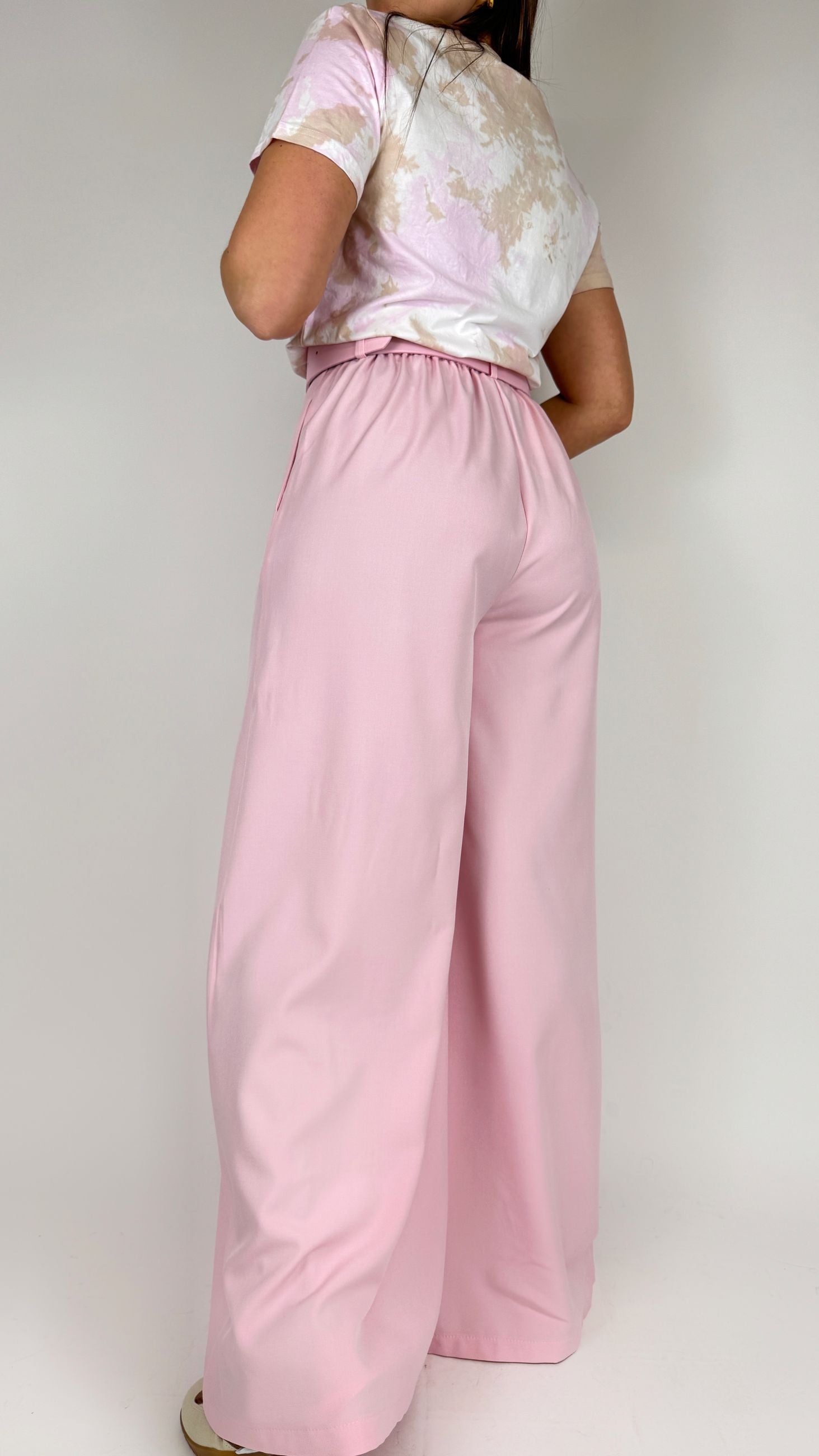 Pantalone morbido palazzo, con elastico in vita sul dietro, passanti per cintura in ecopelle compresa, chiusura con zip invisibile laterale.