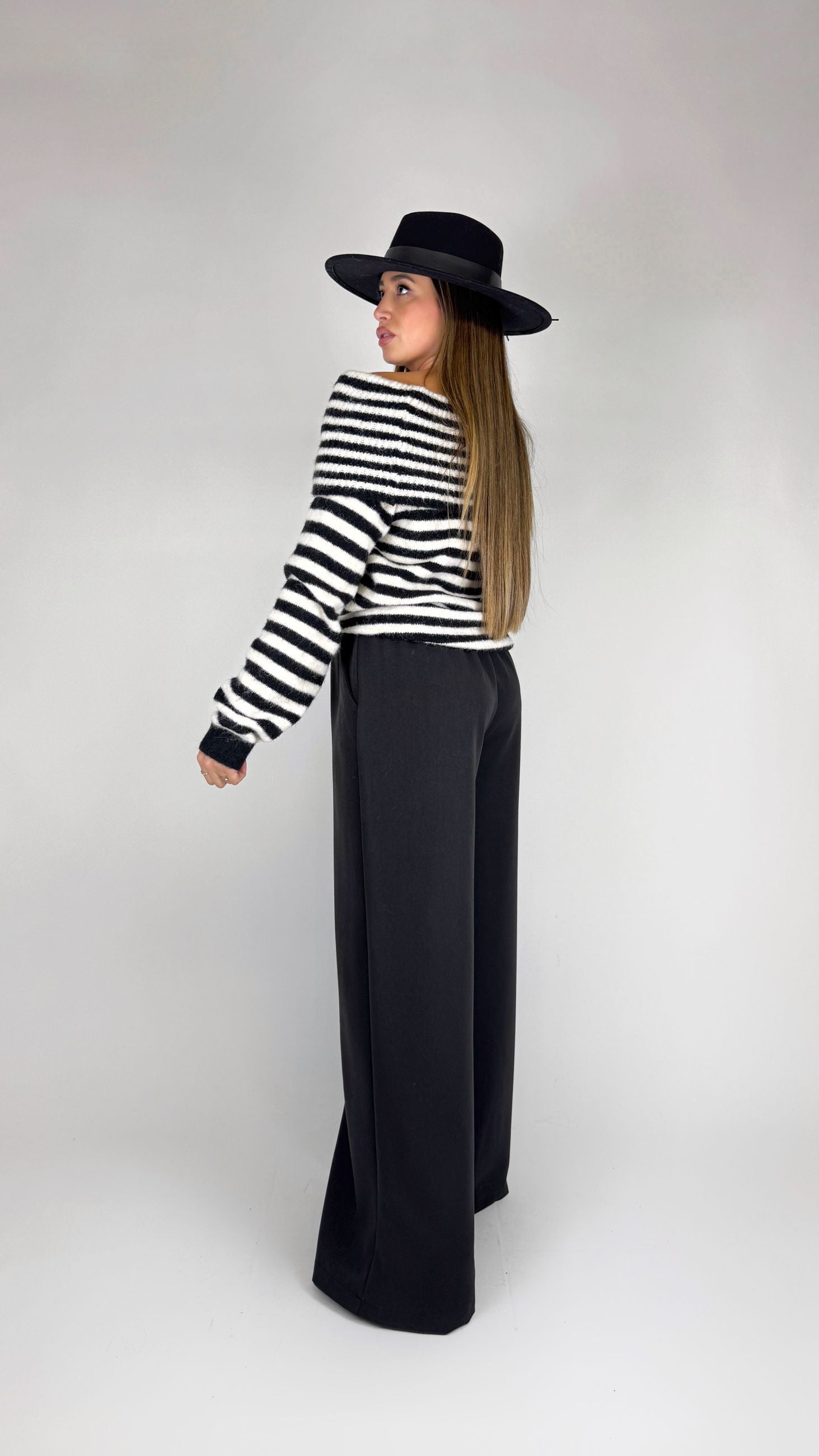 Pantalone gamba larga, elastico sul dietro, tasche laterali.