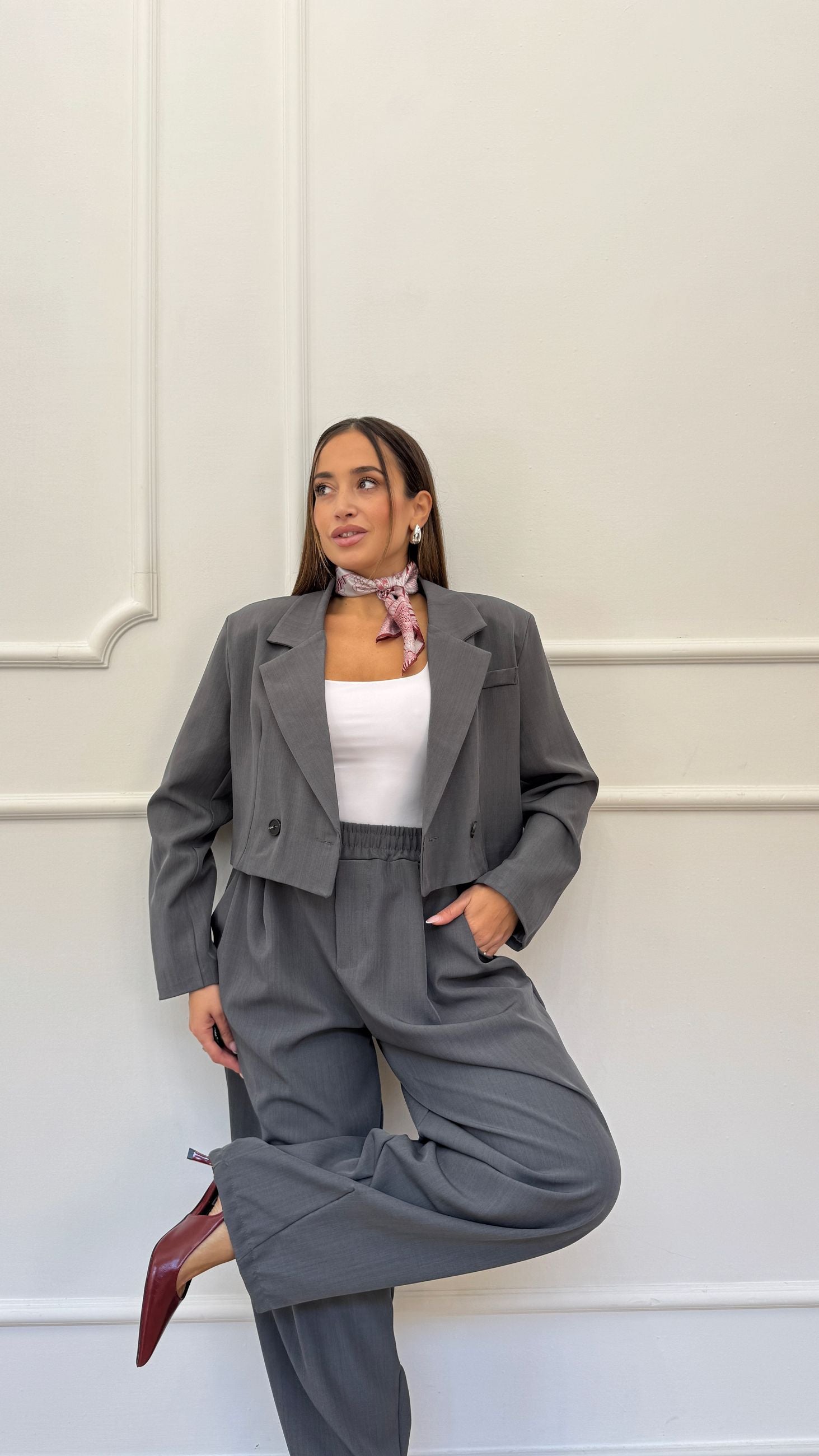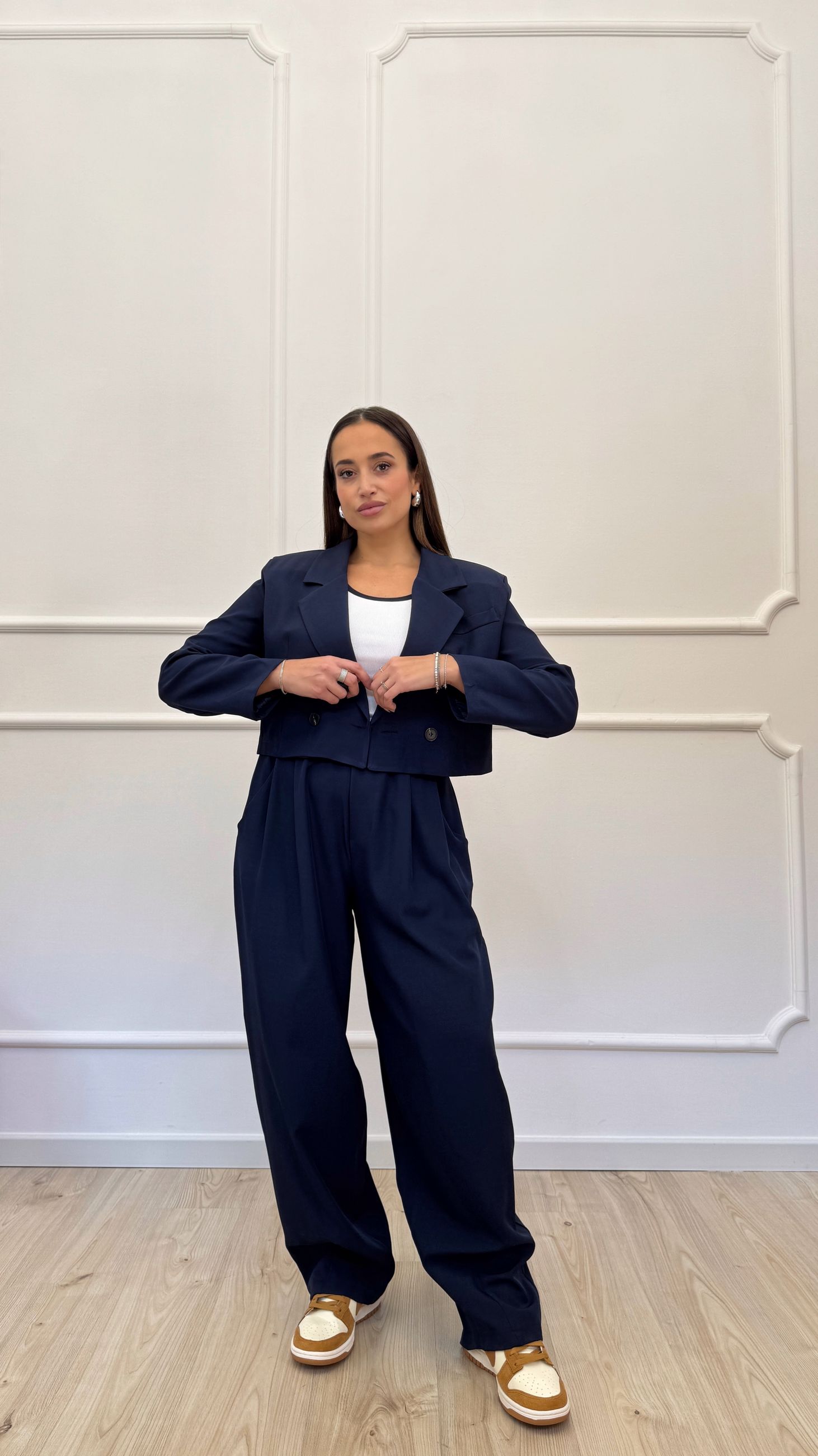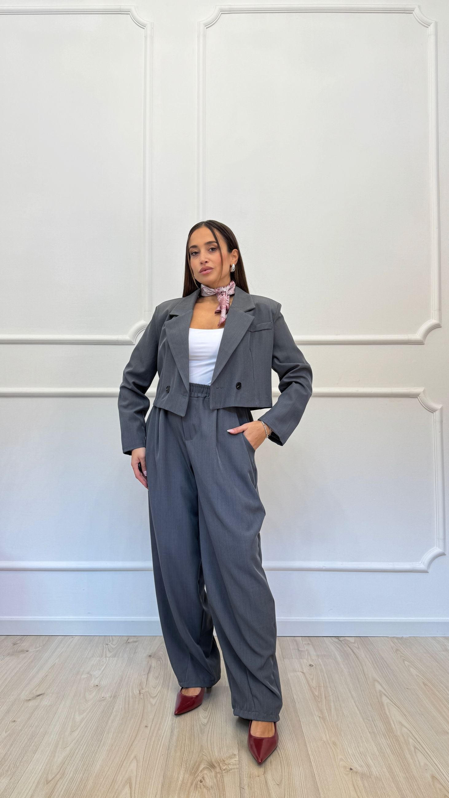 Giacca crop doppiopetto, spalline imbottite, revers classico.