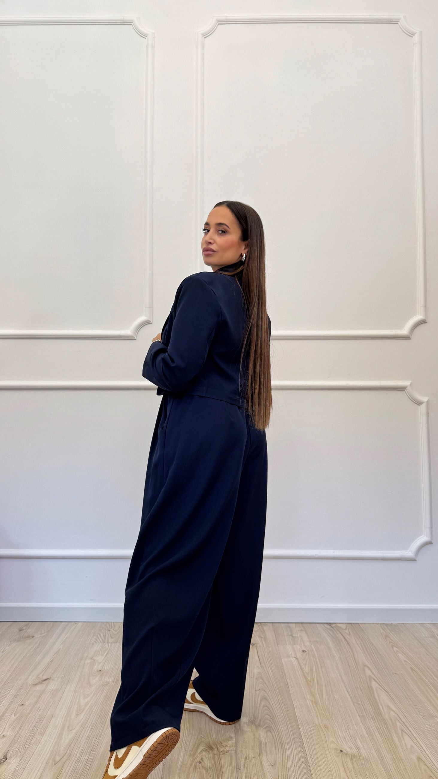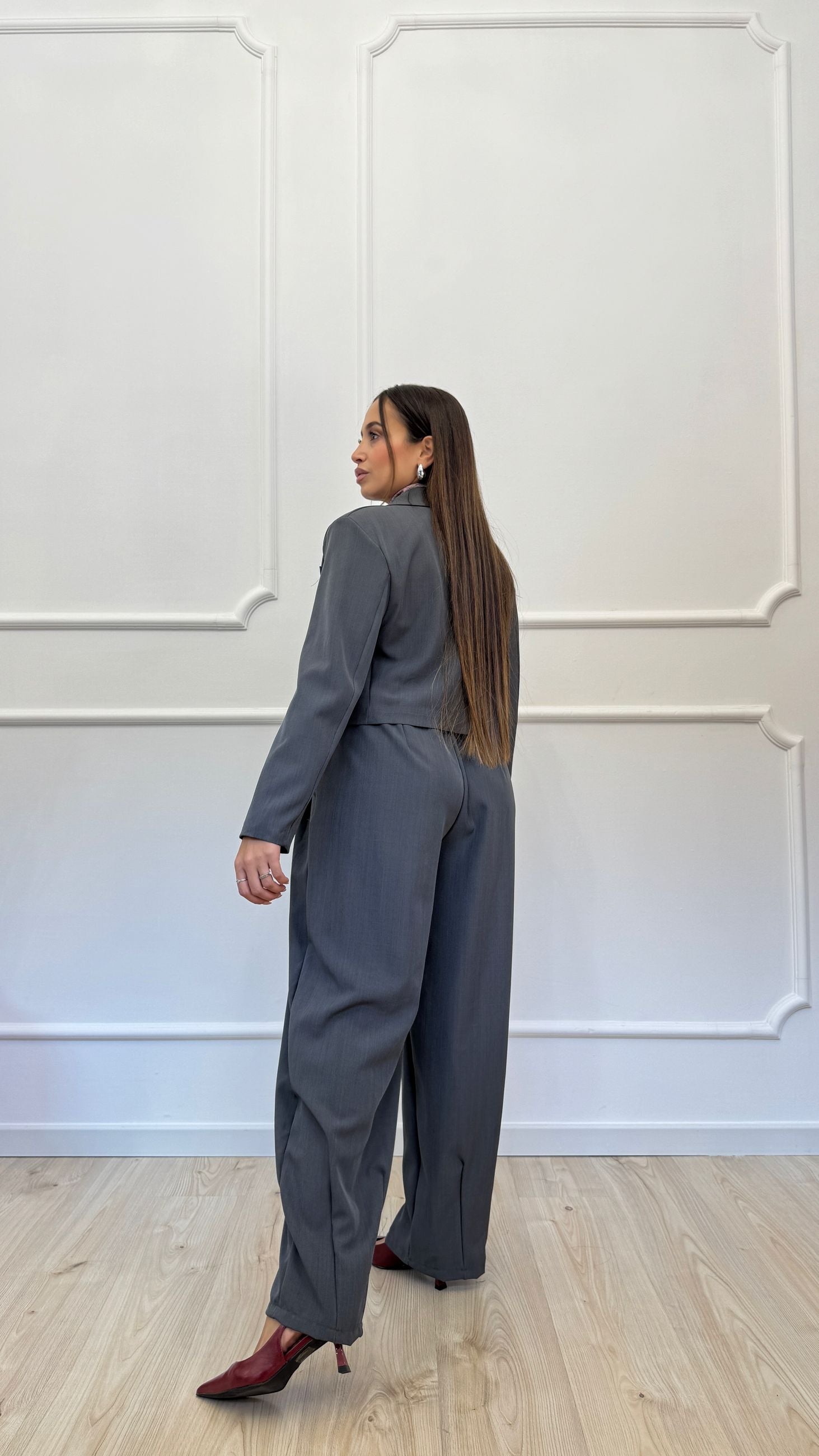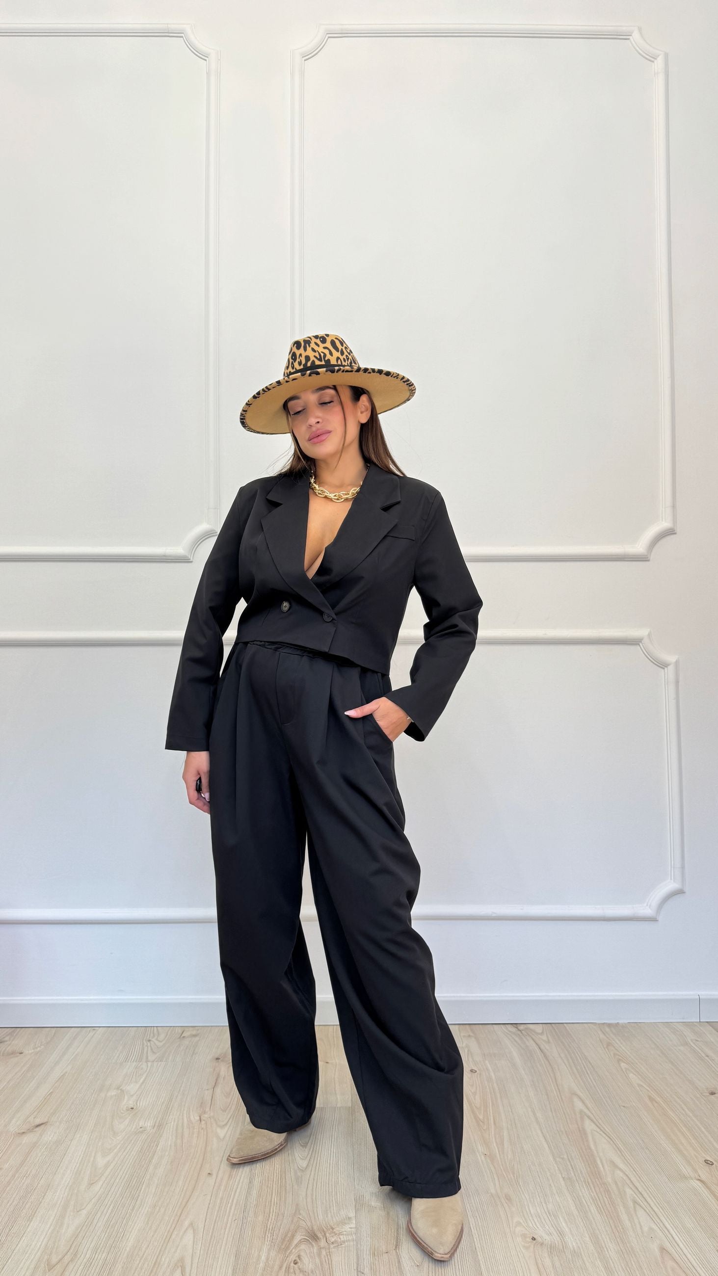 Giacca crop doppiopetto, spalline imbottite, revers classico.