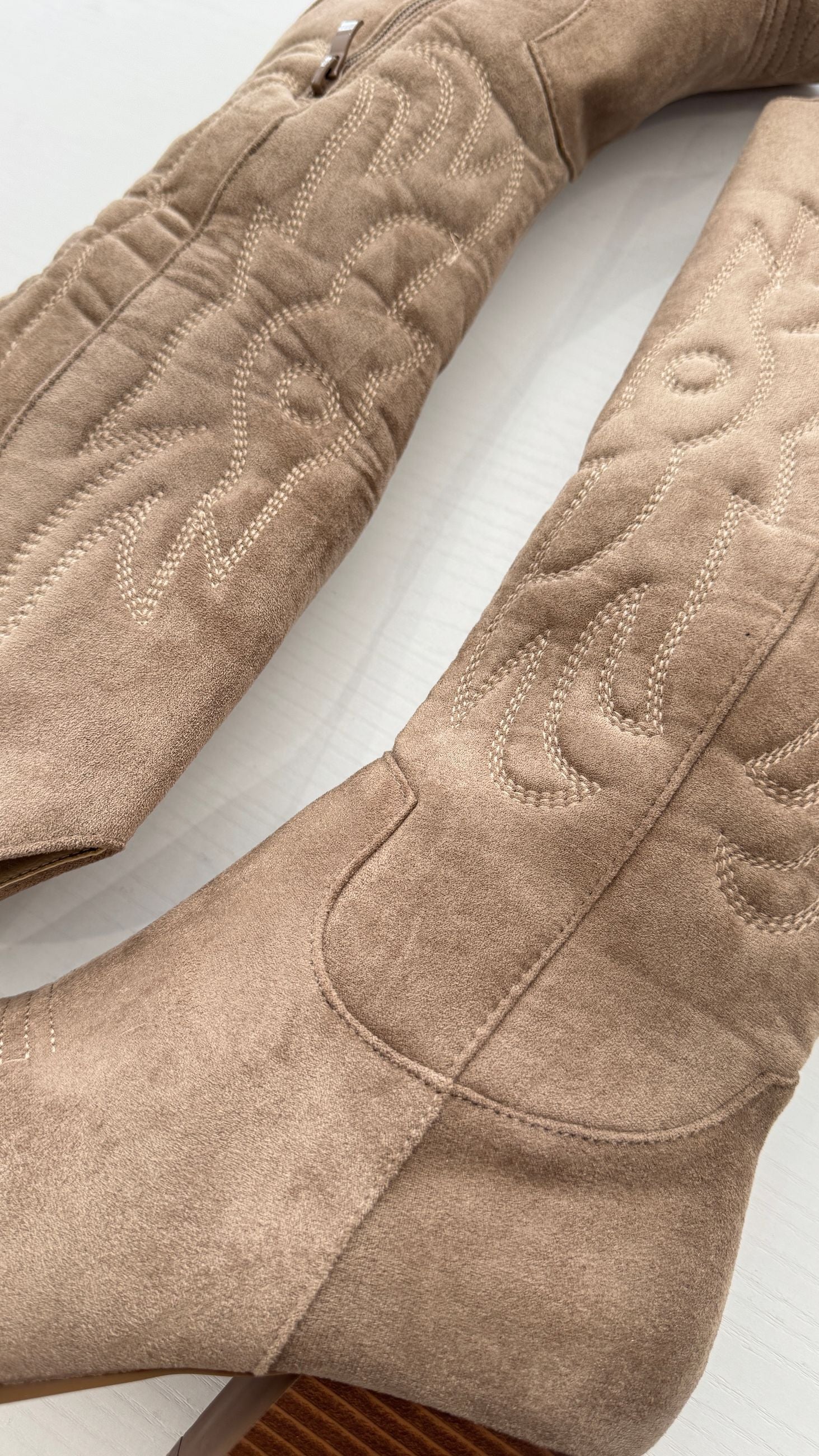 Stivale texano in camoscio con ricami, interno imbottito, cerniera lato interno.