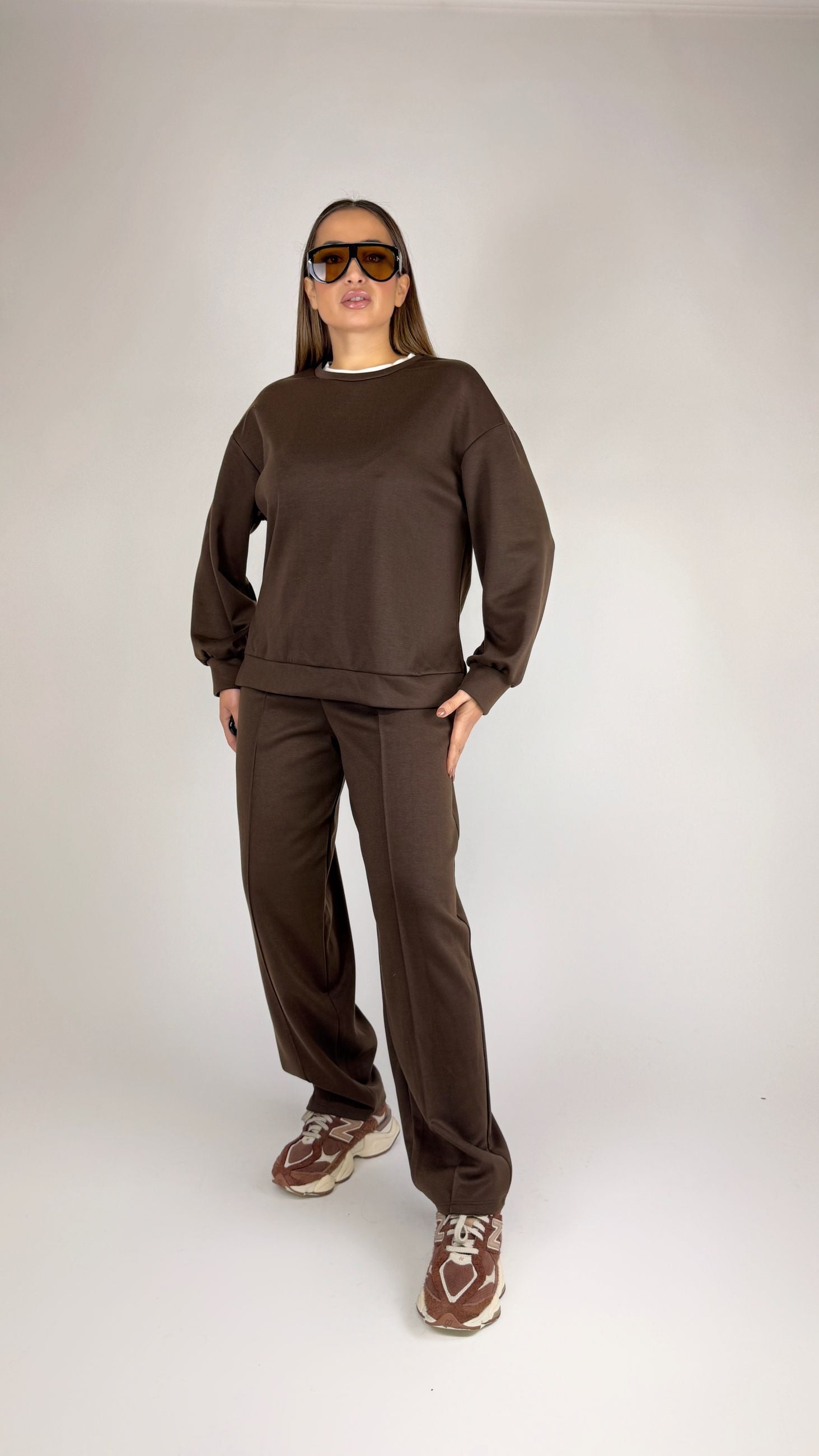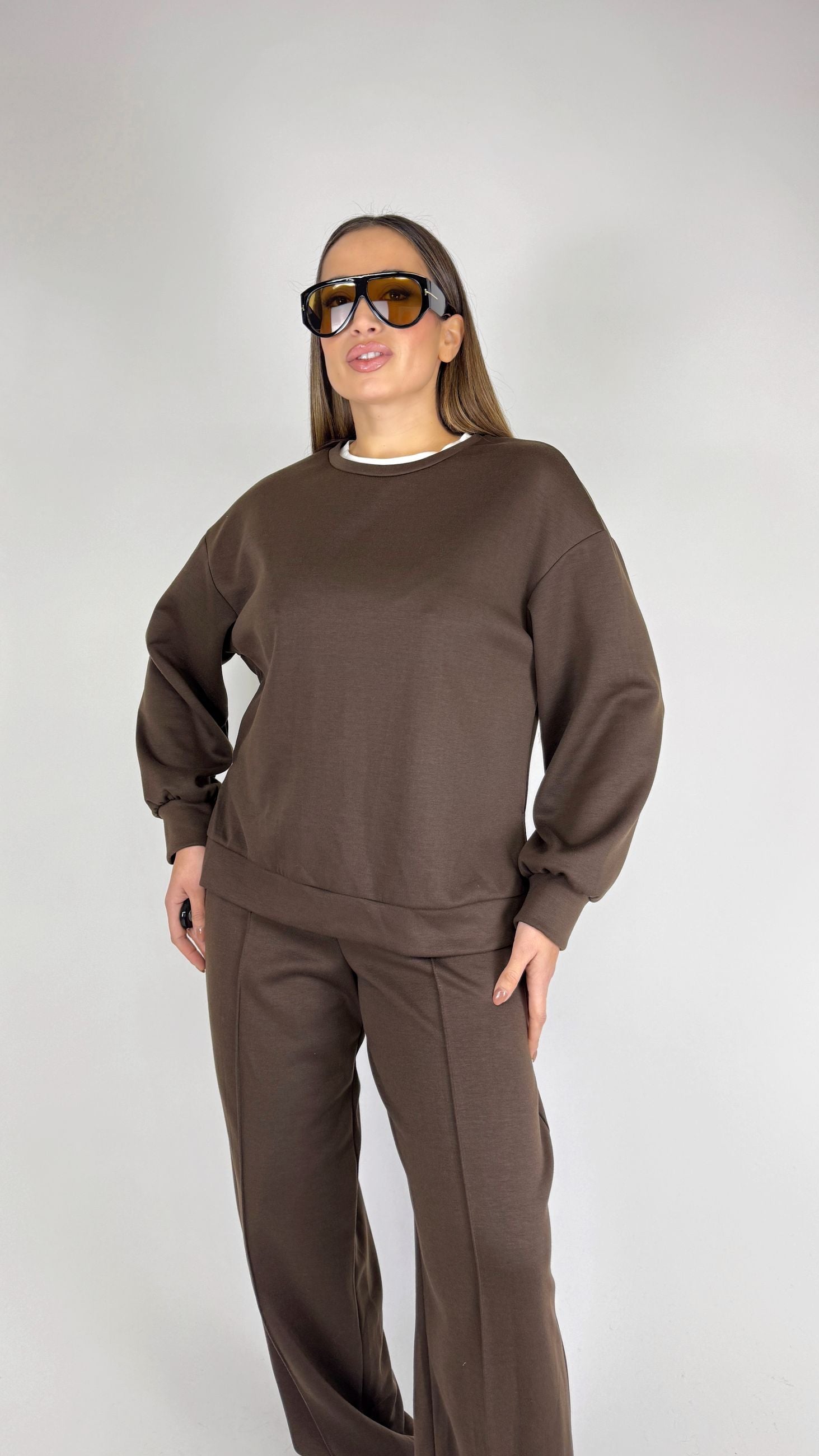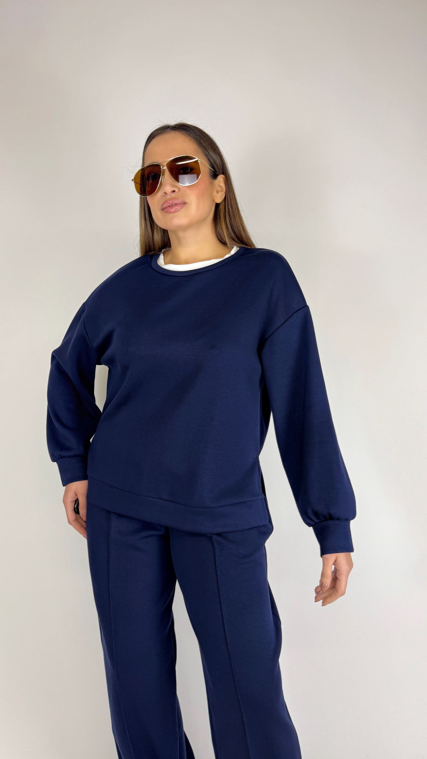 Felpa ampia girocollo con bordino in contrasto colore.