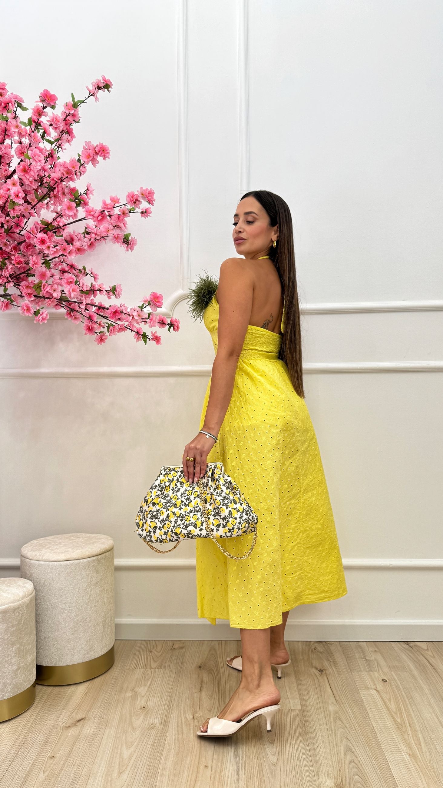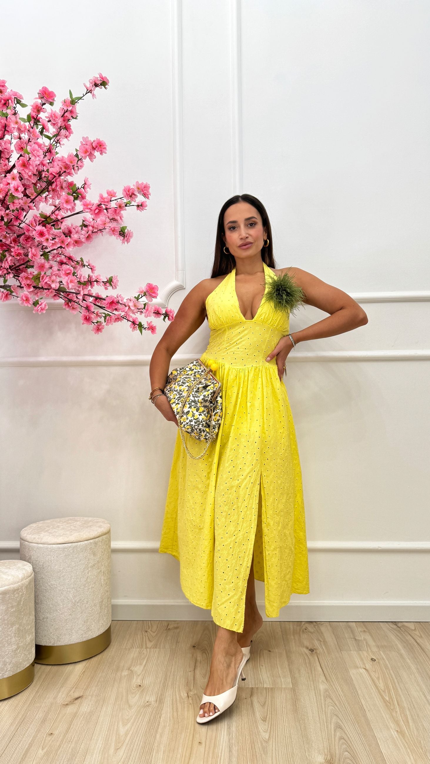 Vestito Pizzo San Gallo midi, scollo regolabile al collo, scollatura a V, elastico sul dietro, laterali ampi.