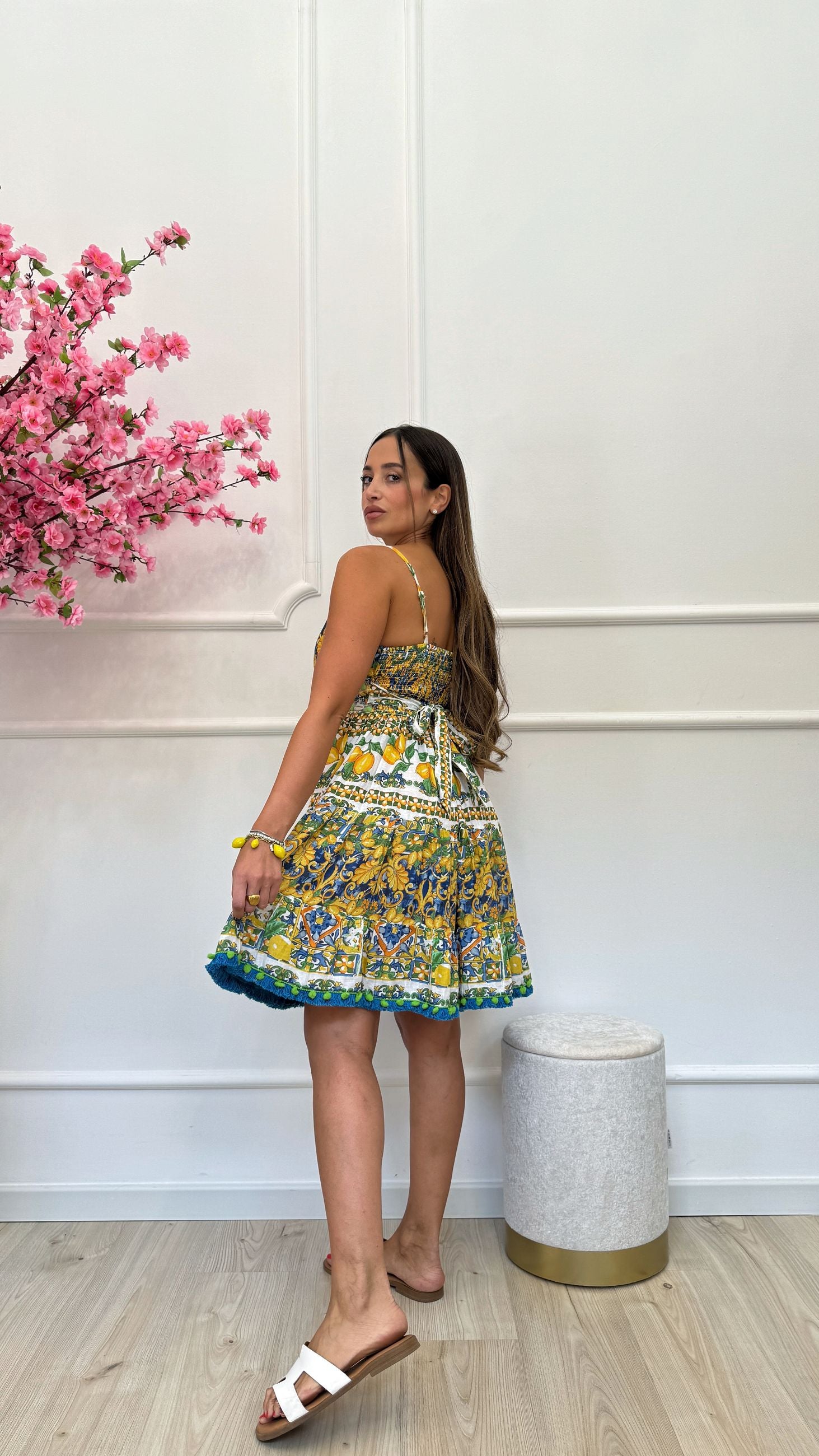 Vestito in cotone corto fantasia, scollo a V, bretelle sottili regolabili, fiocco in vita regolabile sul dieto, applicazione conchiglie in vita., orlo rifinito con nappine e frange.