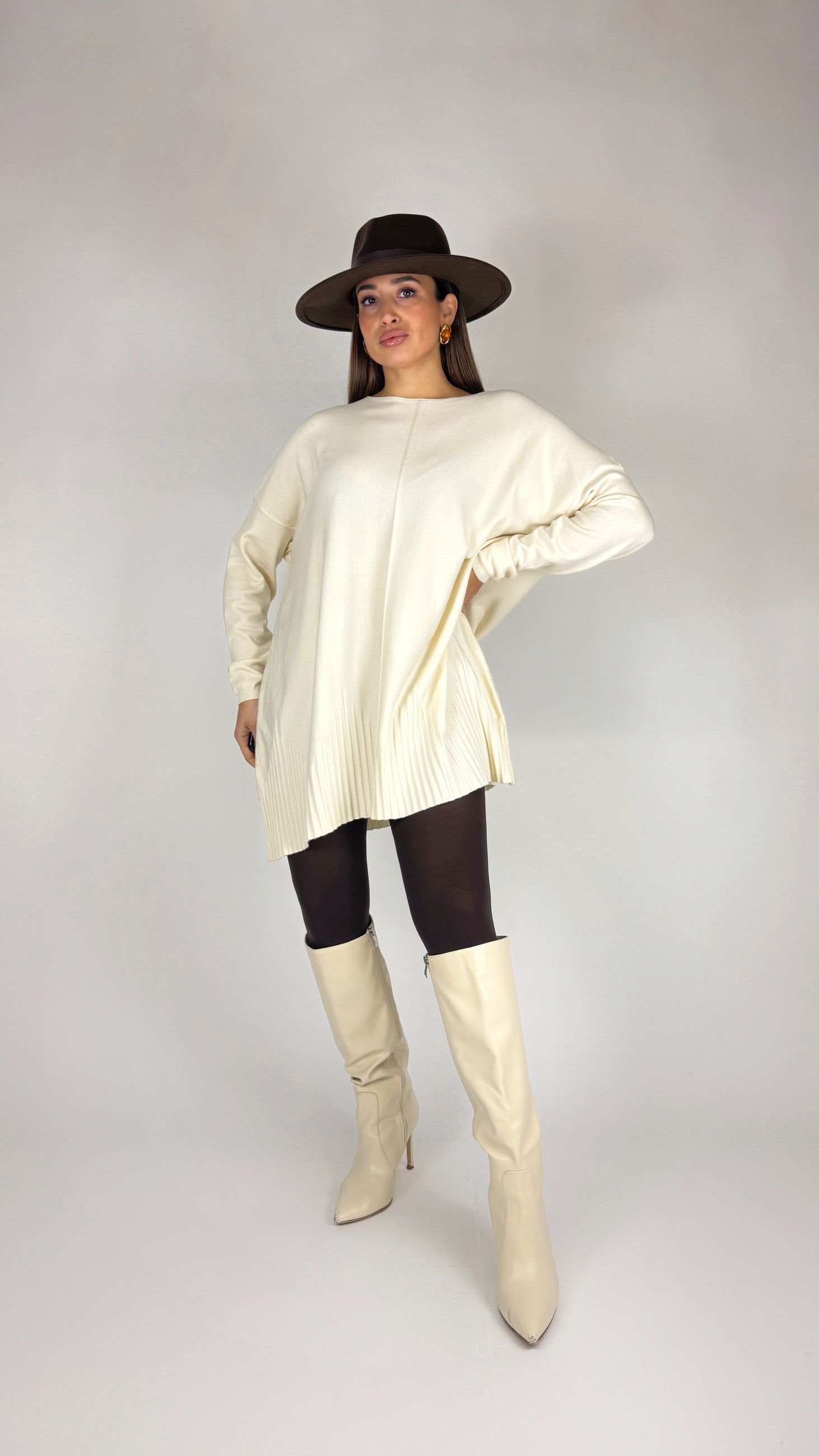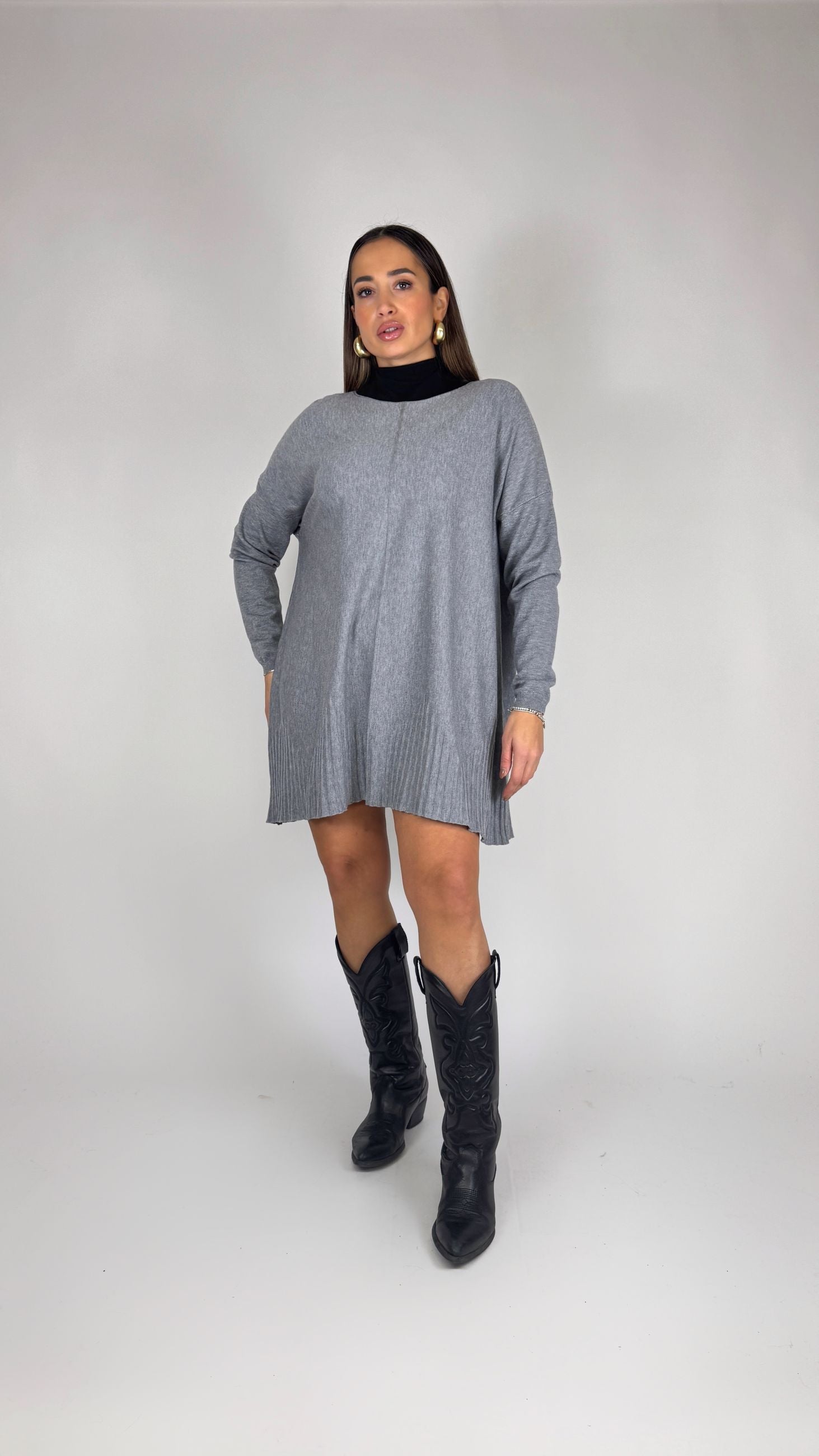 Vestito in maglina ampio, maniche lunghe, girocollo ampio, spalla scesa, lavorazione a costine all'orlo.